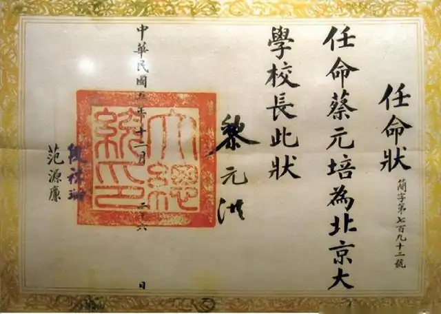 ▲ 任命蔡元培为北大校长的任命状