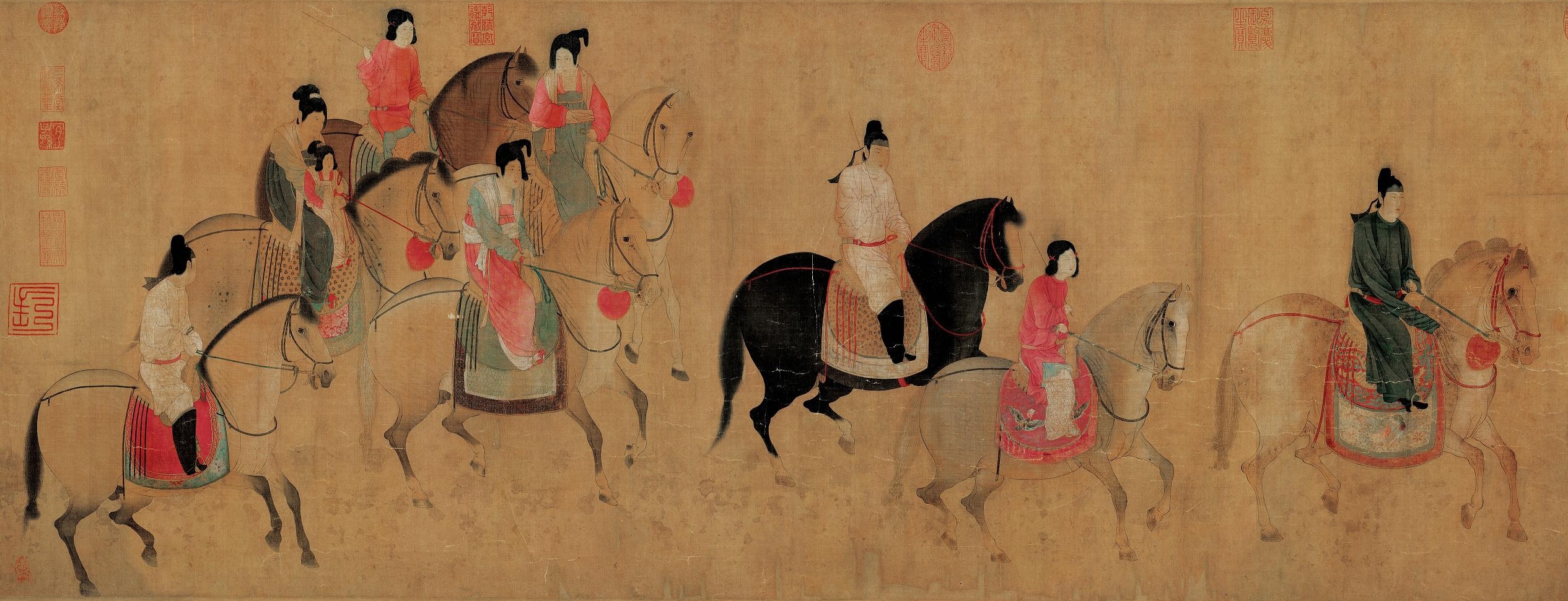 《虢国夫人游春图》是唐代一幅珍贵的人物画名作,为宫廷画家张萱所绘,现存为北宋摹本,藏于辽宁省博物馆。画卷生动描绘了虢国夫人及其眷从春日策马游玩的场景,共绘九人八马,人物衣饰华美,马匹丰腴健壮,整体气息从容典雅,充分展现了盛唐时期的贵族生活与审美风尚。画中最引人入胜之处,在于人物身份并未标明,究竟哪位是虢国夫人至今仍无定论,这使画面本身成为一个值得“细读”的视觉现场,邀请观者超越历史文本,直接感受唐代绘画中的线条、色彩与生命气息。