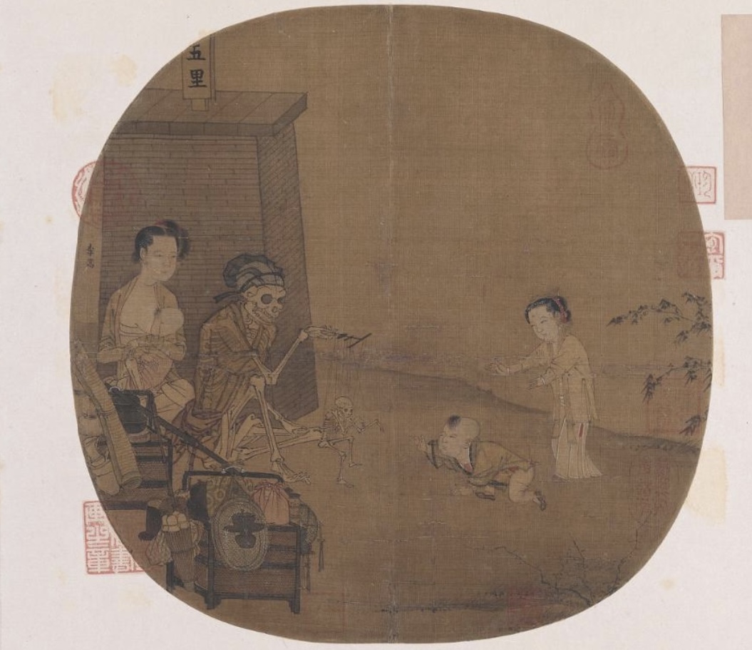 - 《骷髅幻戏图》出自南宋画家李嵩之手,是一幅以扇面为形制、绢本设色的小幅作品。画面中,一个披着破旧衣衫的骷髅,正操纵着幻戏道具卖艺,两旁两个孩子看得津津有味,神态好奇却并不恐惧。作品笔触细腻、设色清雅,既保留了市井题材的生动观察,又融入了宋人寓意式的思考,被视为宋代绘画中少见的、将娱乐、寓言与哲理融合在一起的杰作。作品现藏于故宫博物院。