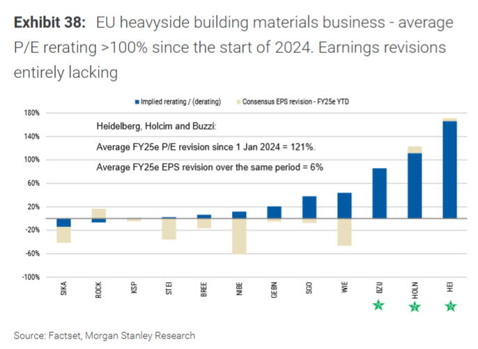 为啥重资产不香了?看这张图就懂(Exhibit 38:EU heavyside building materials business - average P/E rerating >100% since the start of 2024,研报第15页)。
