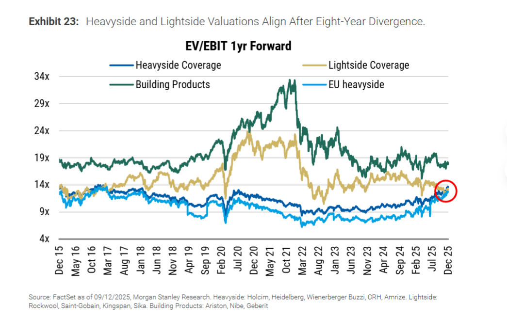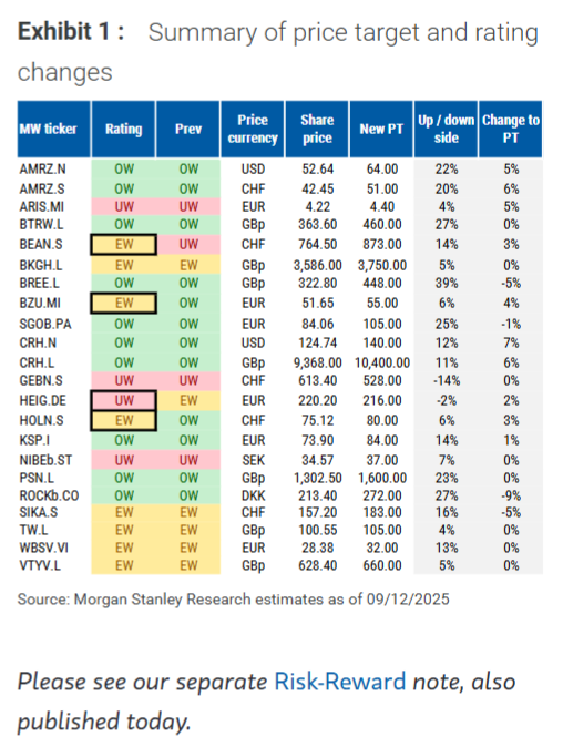 大摩直接下调了三家重资产巨头:Holcim和Buzzi从超配降至中性,Heidelberg更是降至低配。反观轻资产的圣戈班(Saint Gobain)被列为头号推荐,13.4倍的2026年预期P/E估值堪称便宜,叠加欧盟 residential 市场上涨、业务结构优化和资产负债表灵活性,成长空间十足。