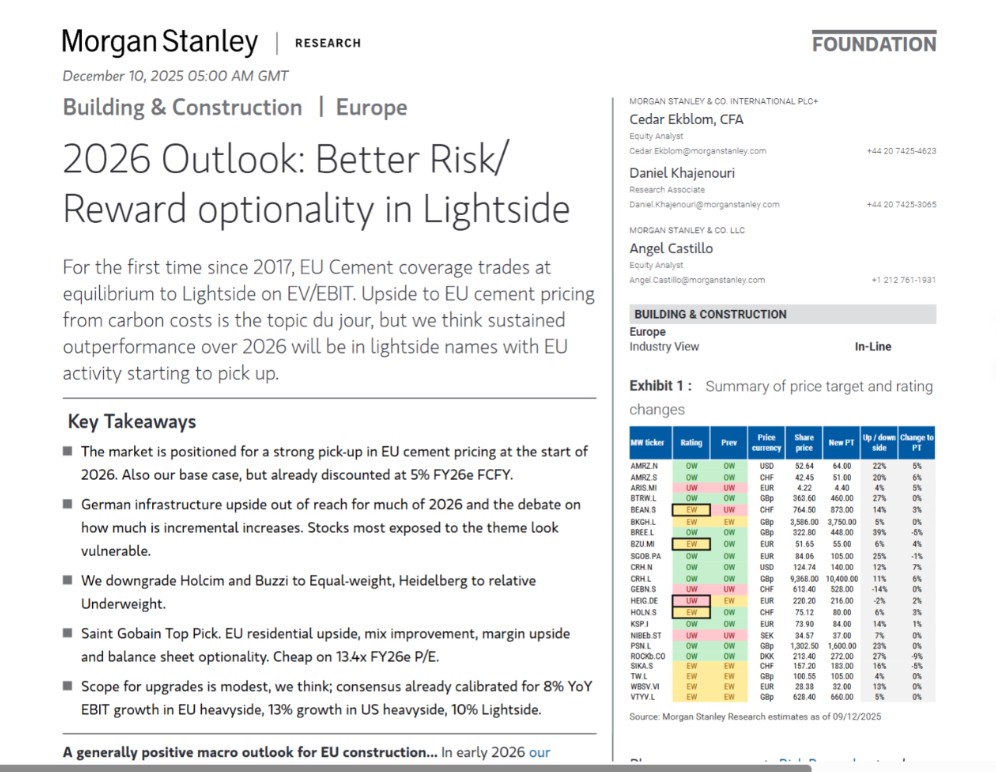 这篇来自摩根士丹利(Morgan Stanley)2025年12月10日发布的《2026 Outlook:Better Risk/Reward optionality in Lightside》研报,聚焦欧美建筑建材行业,用硬核数据和图表揭示了行业大转向。核心结论很明确:2026年欧盟建筑行业温和复苏,但重资产企业估值已顶,轻资产企业凭借 residential 市场反弹和灵活布局,风险回报比更优。