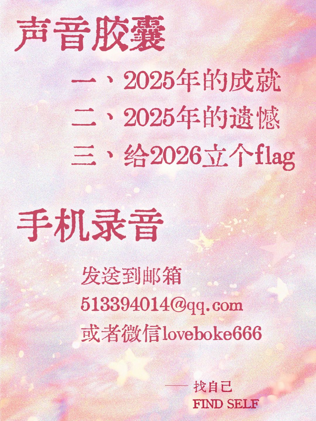 我们还将制作一期“声音胶囊”节目,如果你也想在播客里听到自己的声音,用自己的声音总结过去或是给2026年立个flag的话~~