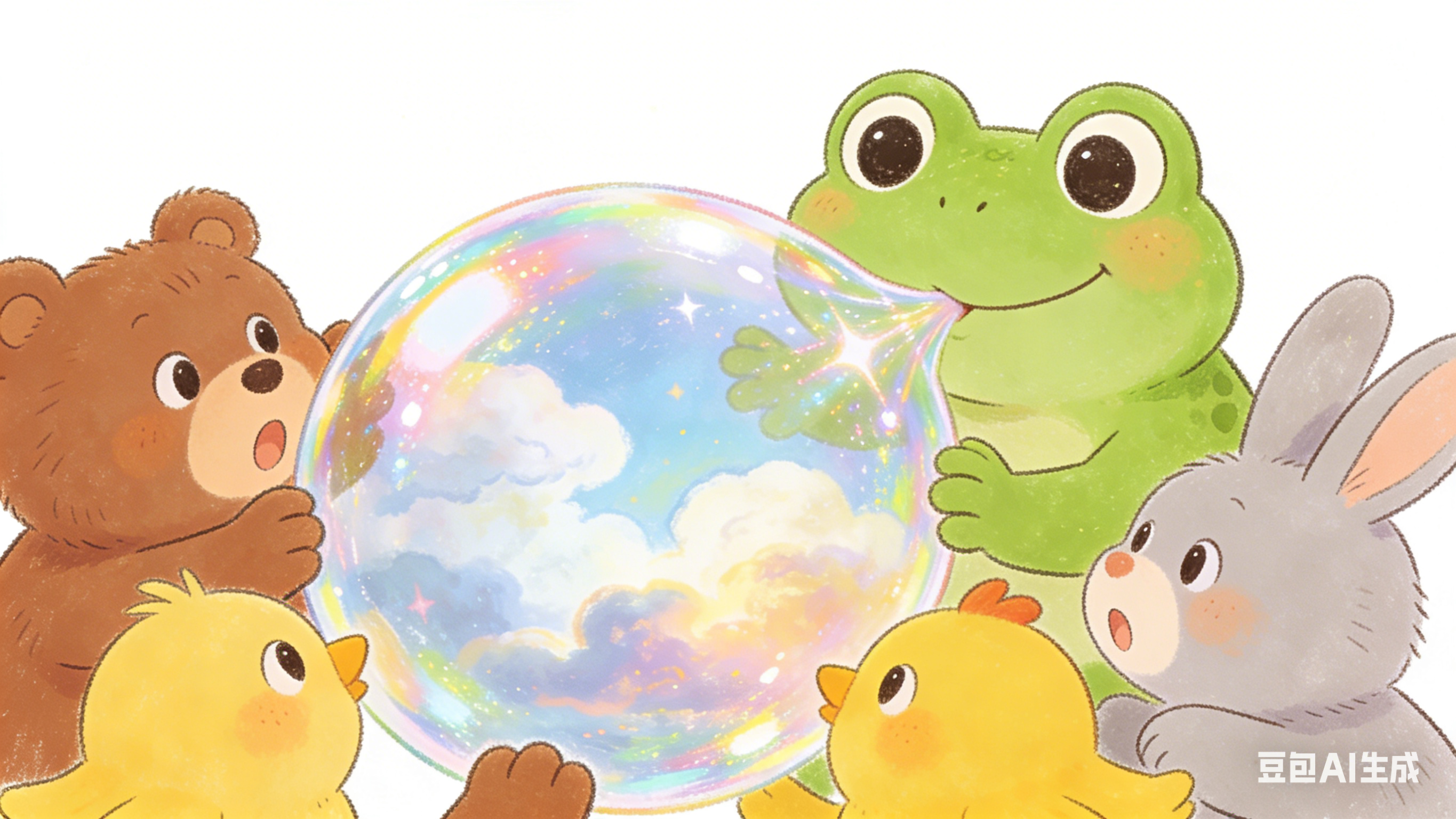 不是普通的泡泡,而是一个闪烁着彩虹光泽的、拳头大小的完美球体。泡泡轻轻飘起,停在半空中,内部有光影流动。动物们凑近看,惊讶地发现泡泡里竟然有画面:一片云朵在蓝天中慢慢变形,从绵羊变成山峰,再变成帆船。