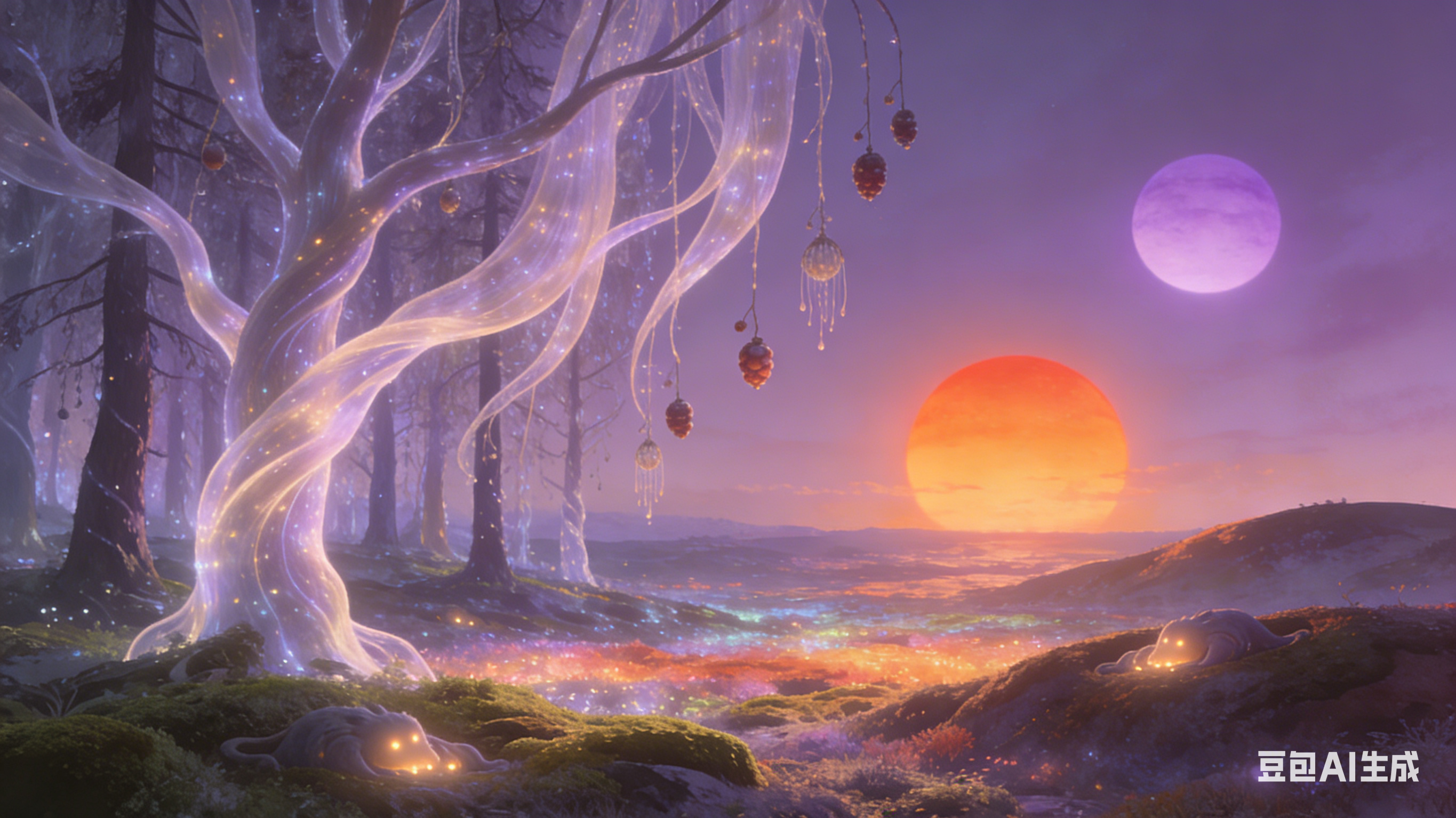 在这里,时间变得很轻很轻……那些生物不需要说话,它们用光的频率分享记忆,用色彩传递温度。你可以躺在一片发光的苔原上,看着两颗夕阳缓缓沉入地平线——一颗橙红,一颗淡紫,把整个世界染成水彩……