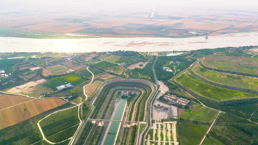 ▲ 跨越黄河的南水北调中线穿黄工程(2020年5月26日摄,无人机照片)。
