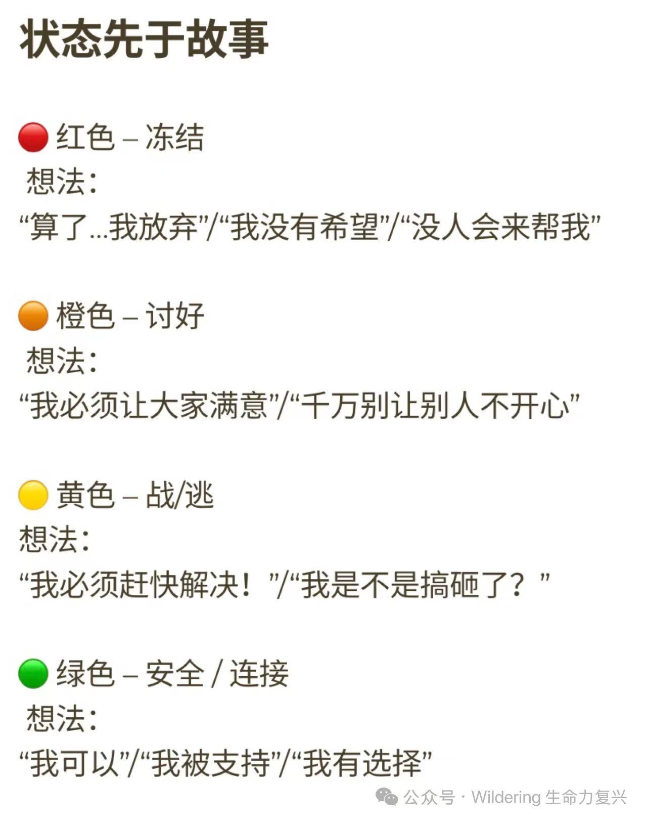 State before stories — 状态先于故事。我们的生理状态(State)先于我们头脑中的故事(Stories),并且往往决定了我们如何看待世界和自己。