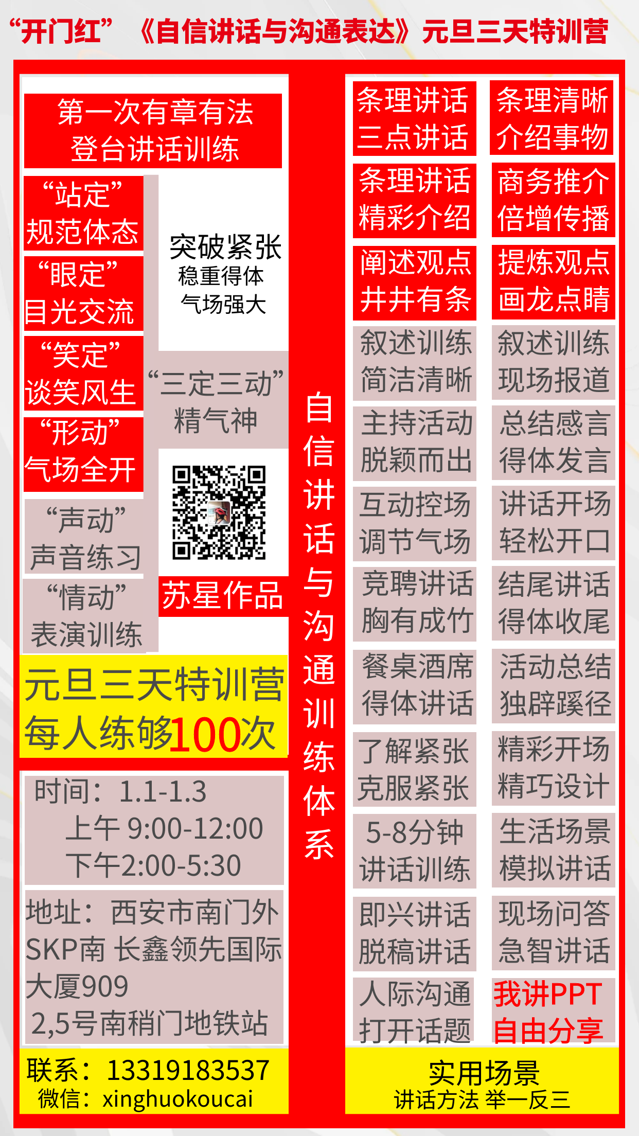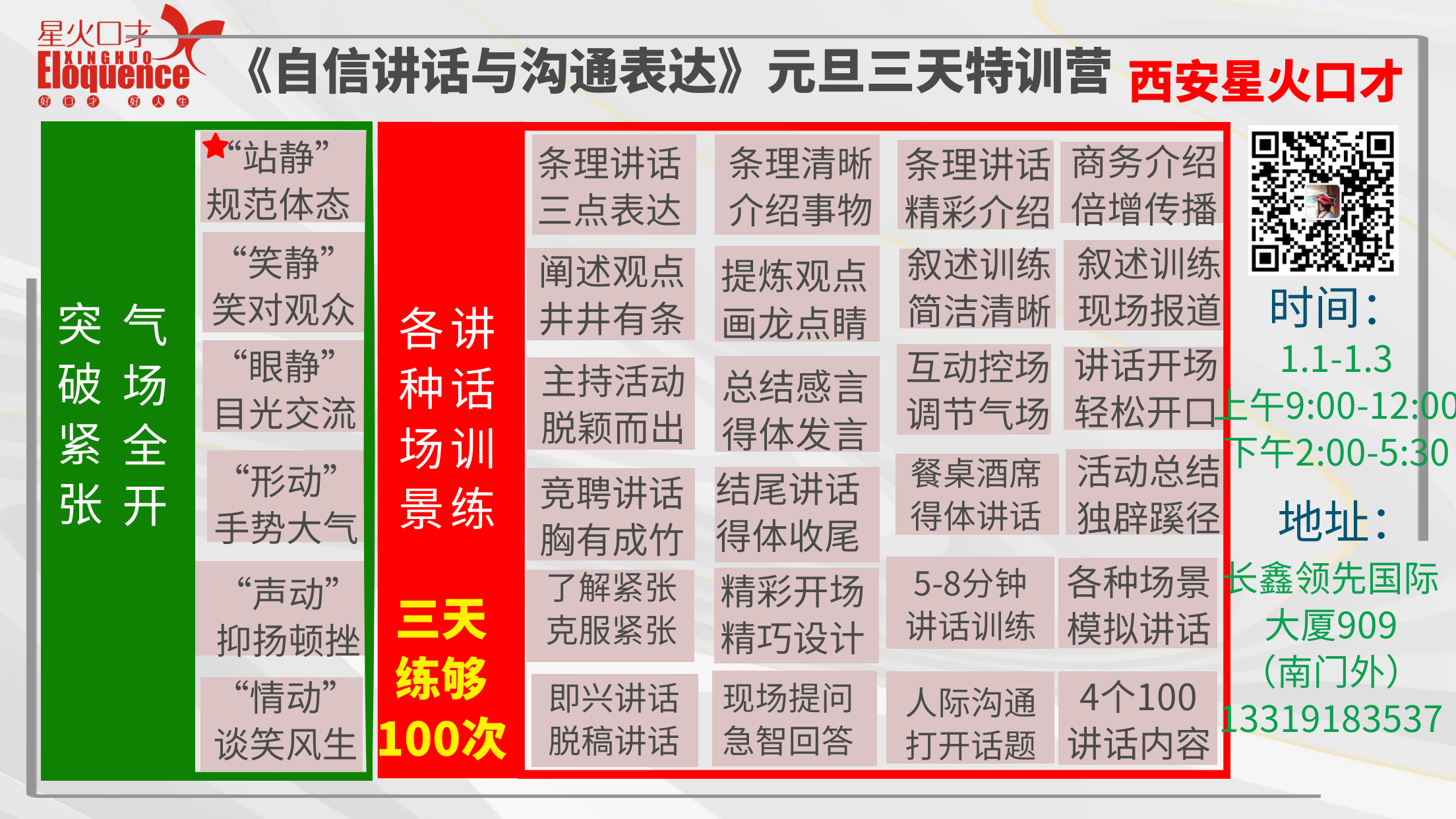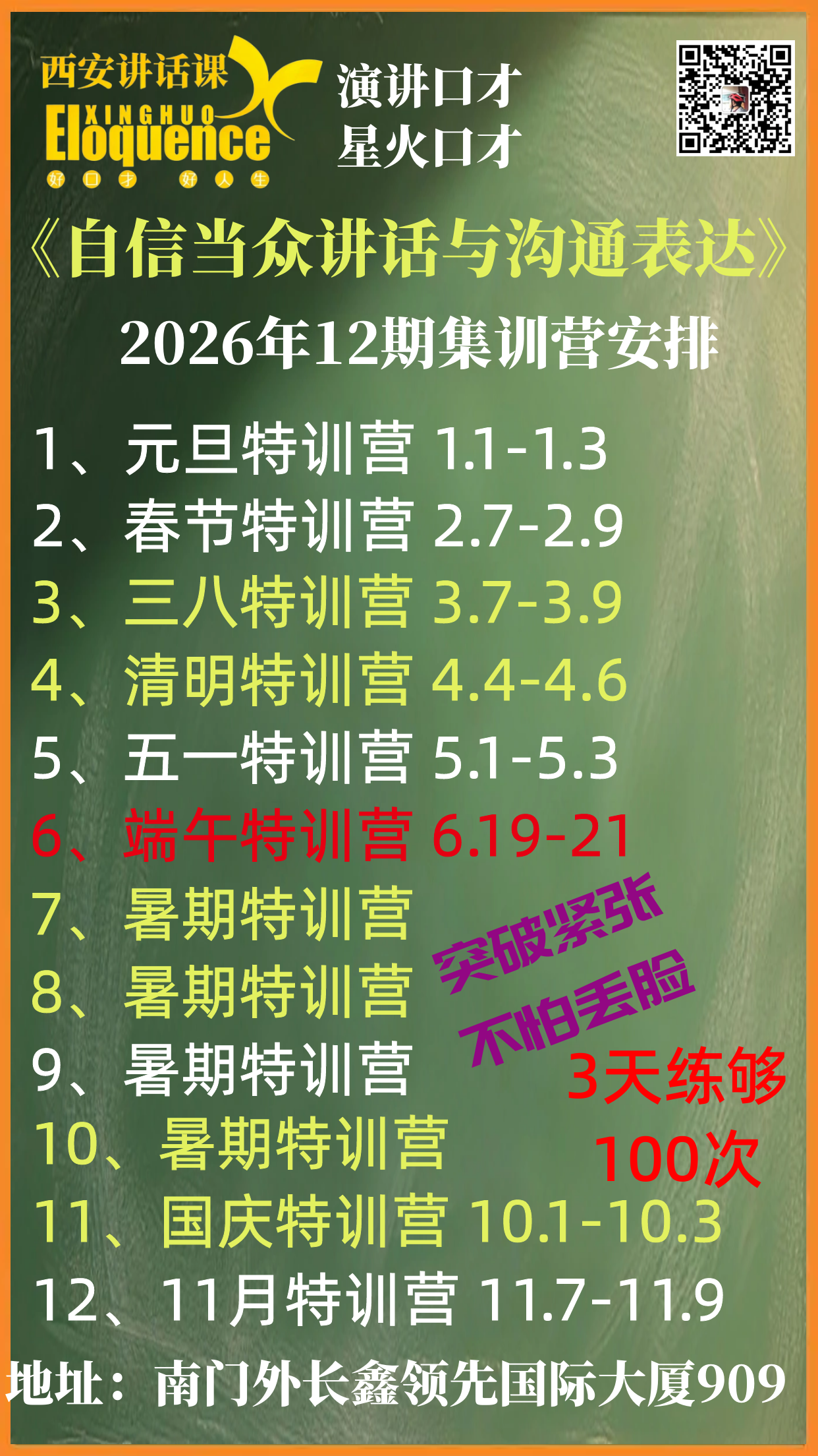 2025-12-28 突破紧张双因素,提高能力八分,心理疏导两分。为什么?元旦三天特训营1.1-1.3100次登台亲身体验训练24个讲话模版3个突破紧张抓手3个打开气场开关!全国招生 相聚长安价格超低 机会超多
