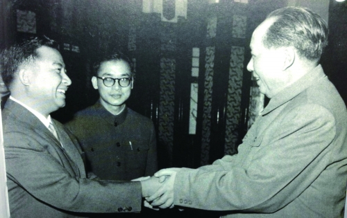 ▲ 1963年,毛泽东会见西哈努克亲王时,何振梁(中)担任翻译。
