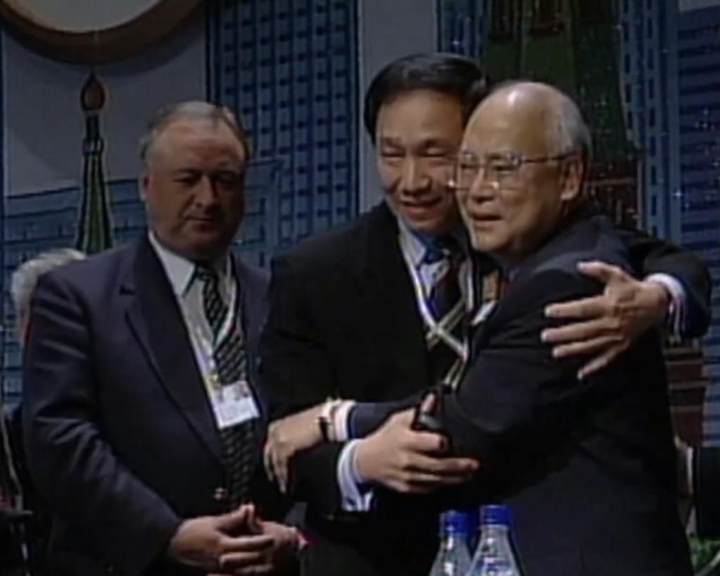 ▲ 在北京获得2008奥运会举办权后,何振梁和中华台北委员吴经国拥抱
