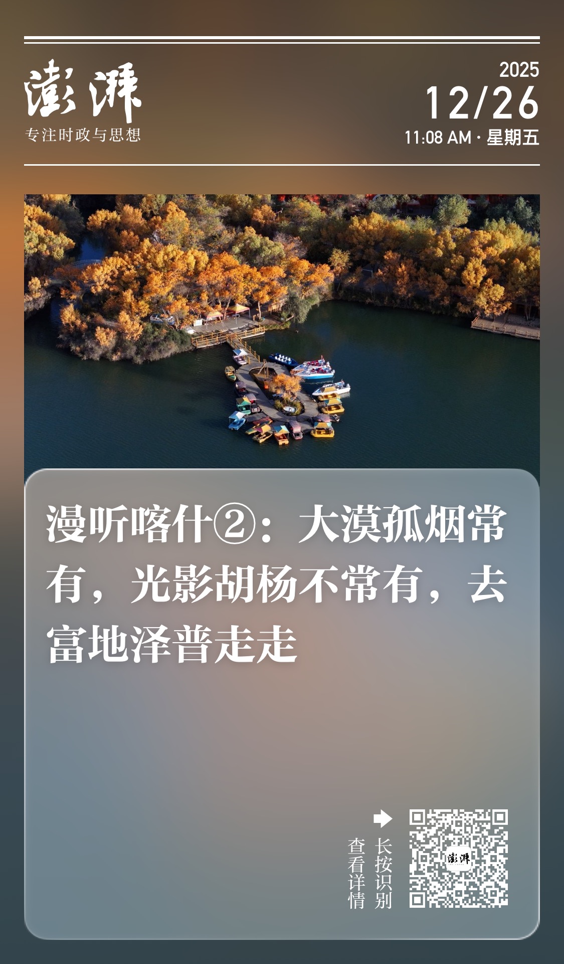 泽普县最引以为傲的生态瑰宝,当属其境内四万亩的天然胡杨林,这里被建成了金湖杨国家森林公园,是南疆首个国家级5A级景区。今天请跟随我们的节目,一起去漫游这片“富饶之地”——喀什泽普。