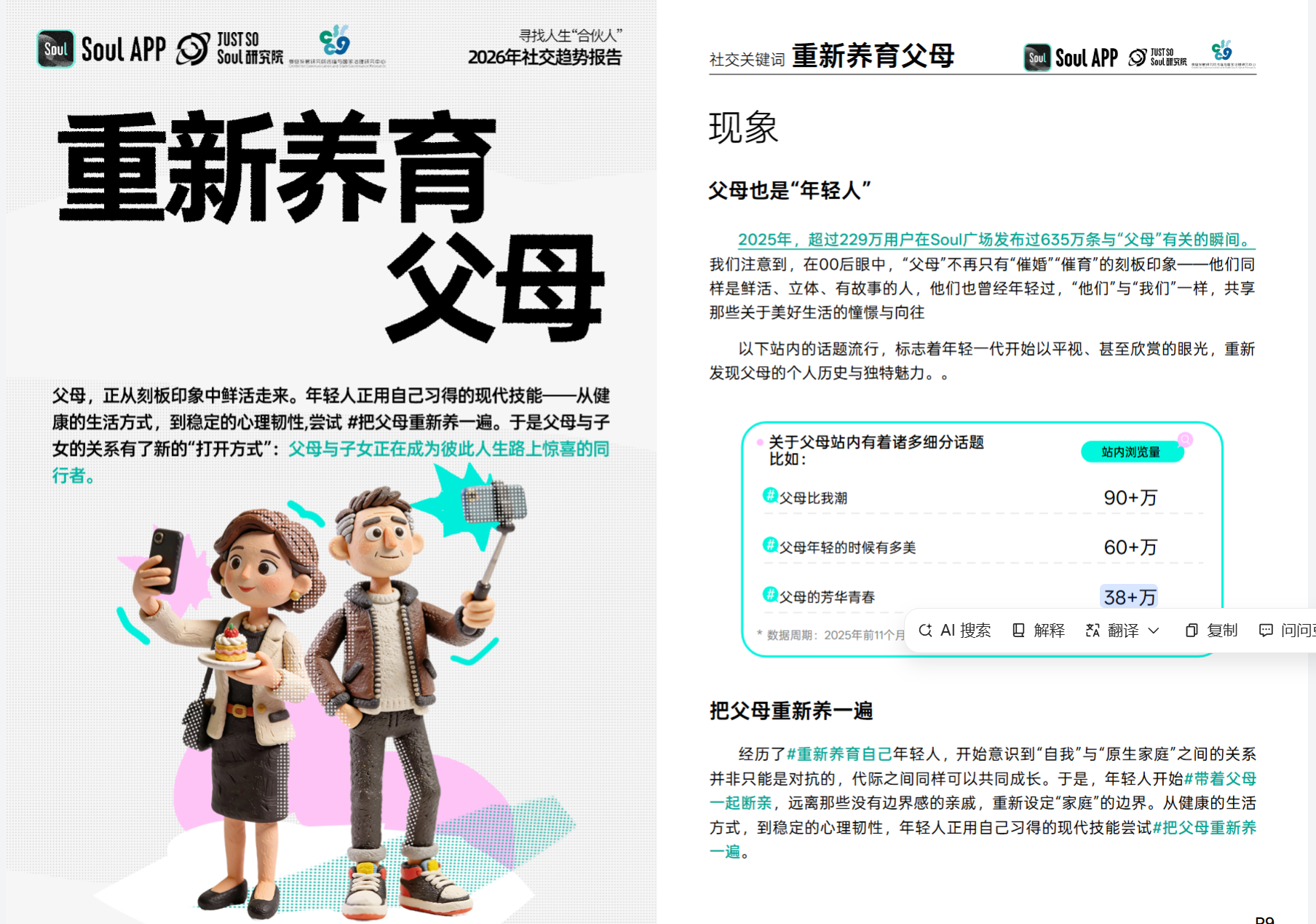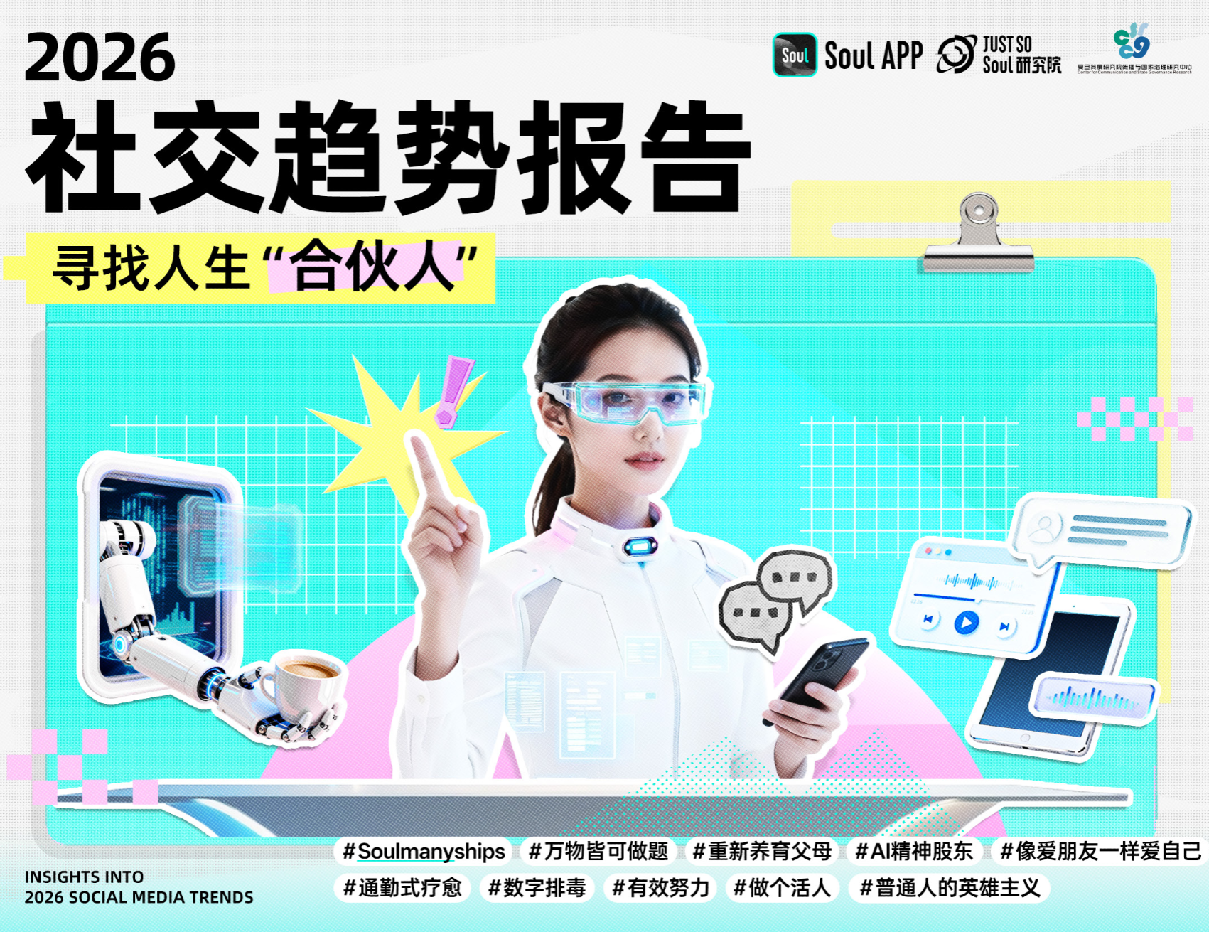 2025年底,Soul App旗下Just So Soul研究院联合复旦大学两大研究中心,基于9812份有效问卷发布《2026年社交趋势报告》,推翻了“年轻人社交冷漠”的刻板印象——他们不是不爱社交,而是正在重构一套更自由、真诚、有趣的社交新逻辑,核心就是寻找“人生合伙人”。