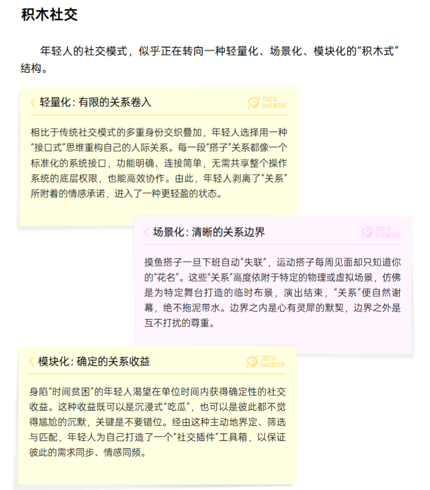 这种社交是轻量化的,像系统接口一样功能明确,不用共享全部生活;是场景化的,运动搭子只在球场相见,下班自动“失联”;更是模块化的,每段关系都能带来确定性收益(图2,P4)。
