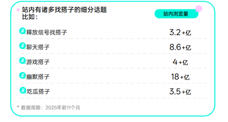 先看最颠覆的“关系重构”:年轻人发明了#Soulmanyships,把社交从盘根错节的网络变成可拆装的积木城堡。2025年,374.6万用户在Soul发布832.5万条“搭子”内容,浏览量超98亿次,#幽默搭子曝光18亿次、#聊天搭子8.6亿次,场景细分到“摸鱼搭子”“吃瓜搭子”(图1,P3)。