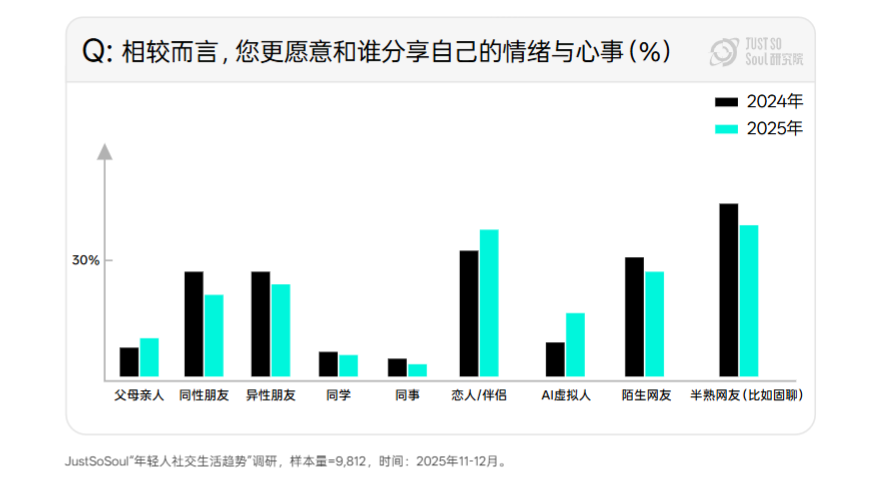 更关键的是“关系提纯”,数据显示,年轻人与同事、普通朋友的情绪分享大幅收缩,转而向父母(+3.3)、恋人(+5.7)、AI虚拟人(+5.4)倾斜,让浅关系更轻松,深关系更厚重(图3,P5)。