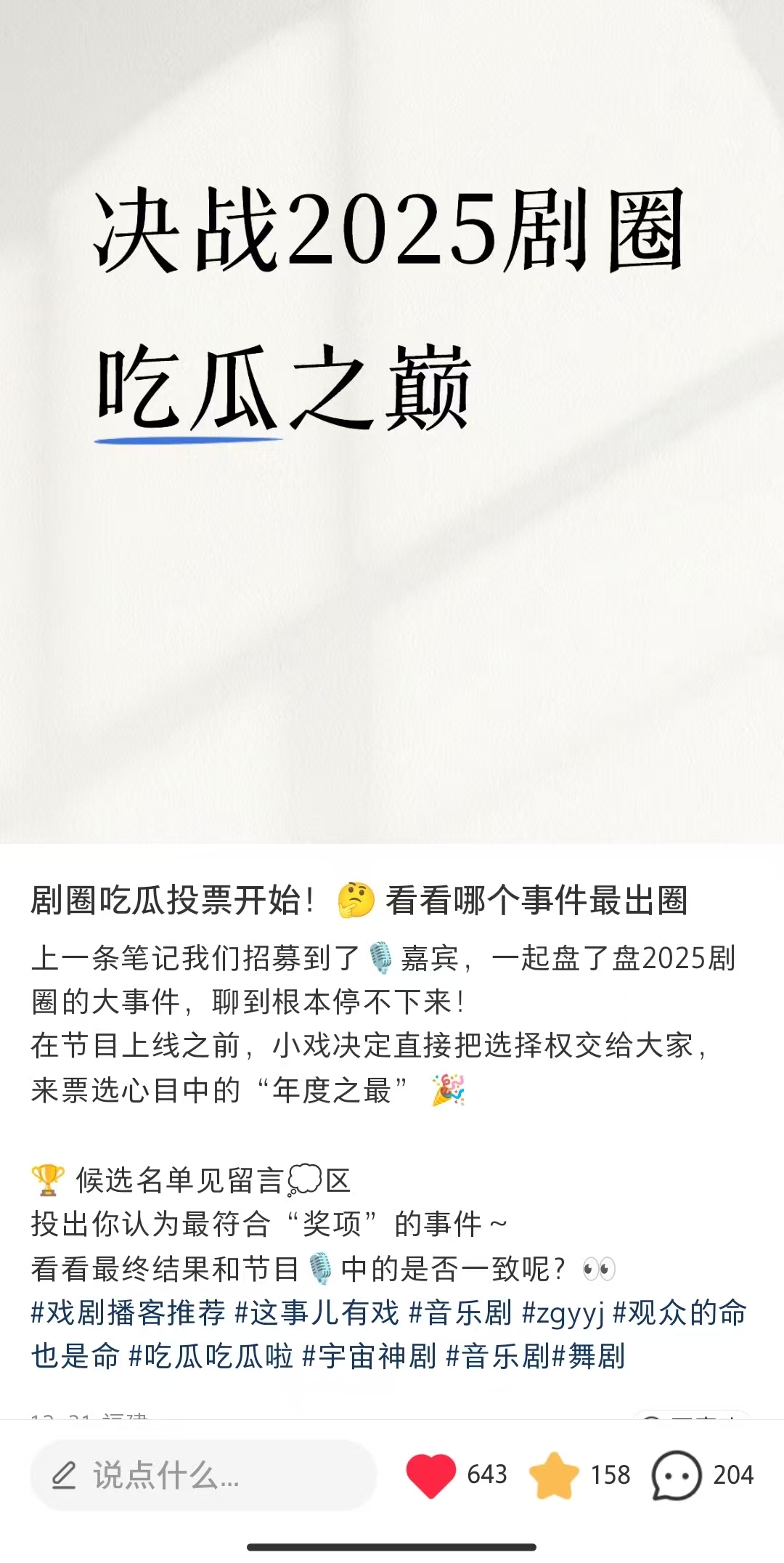 2025就快要结束了,我们一直在想做一期独特的年终总结,回顾又是Drama的一年。今年随着各种投稿Bot在隔壁小地瓜兴起,大字报也成了剧圈的吃瓜圣地。我们也经常会在帖子留一耳朵👂,表达对瓜主的关心()但时常因为赛博采耳店人太多吃瓜费时劳心,通常是急得像瓜田里上窜下跳的猹,于是这期我们打算一口气来盘点2025剧圈那些瓜,并做成颁奖典礼圆桌企划,主持是主播小韩,评审团分别是我们这事儿有戏的主播鸽子老师和嘉宾坐标系老师!我们来好好聊聊剧圈那些瓜,本企划一共有15个奖项,节目分为上下两期,评选不分排名先后(几位主播结合热度提报),如有你觉得更炸裂的大事件欢迎评论区留言,一起快乐吃瓜!