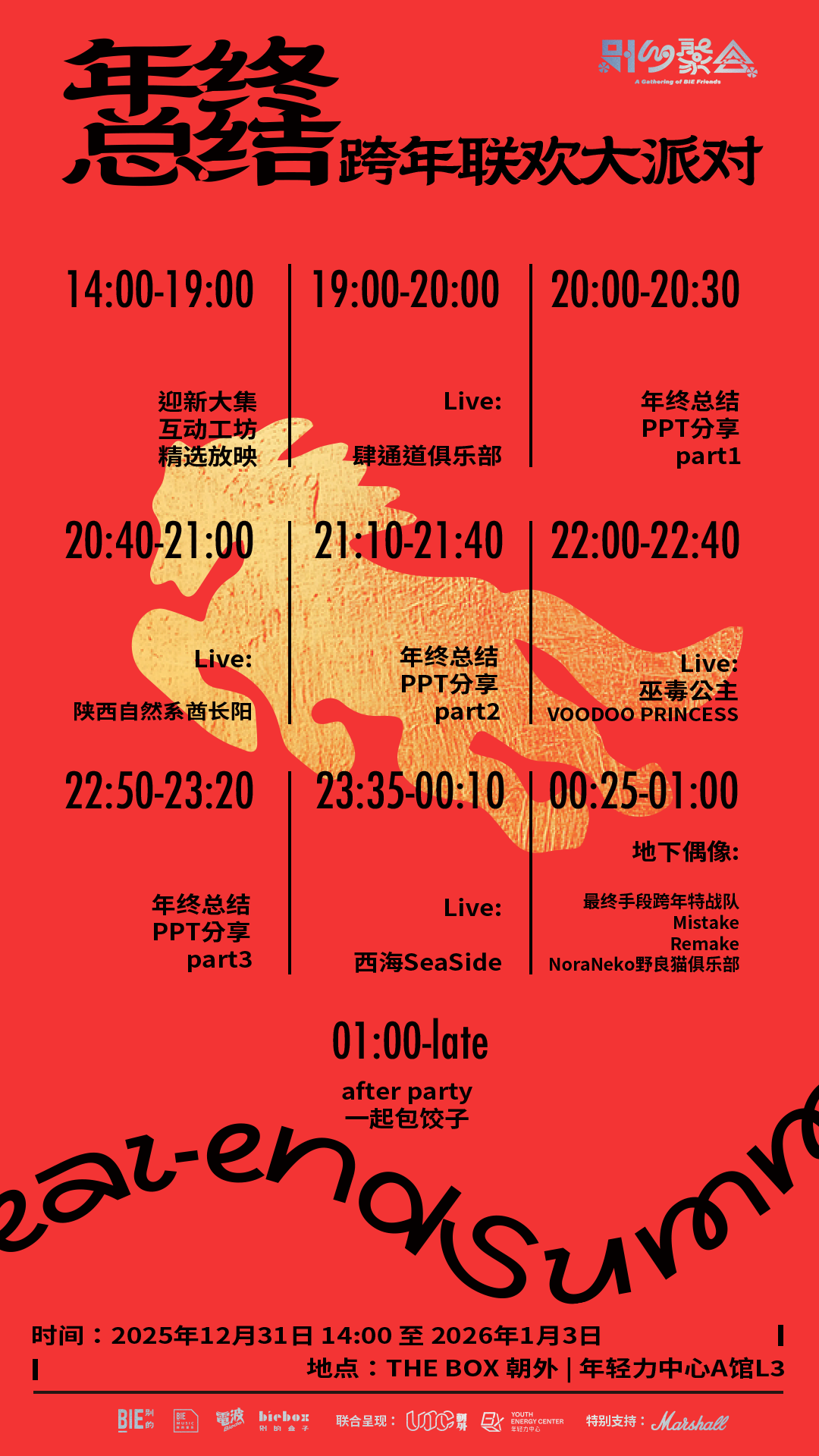 在 12 月 31 日,我们将在北京 THE BOX 朝外|年轻力中心办一场名为「年终总结」的跨年联欢大派对。