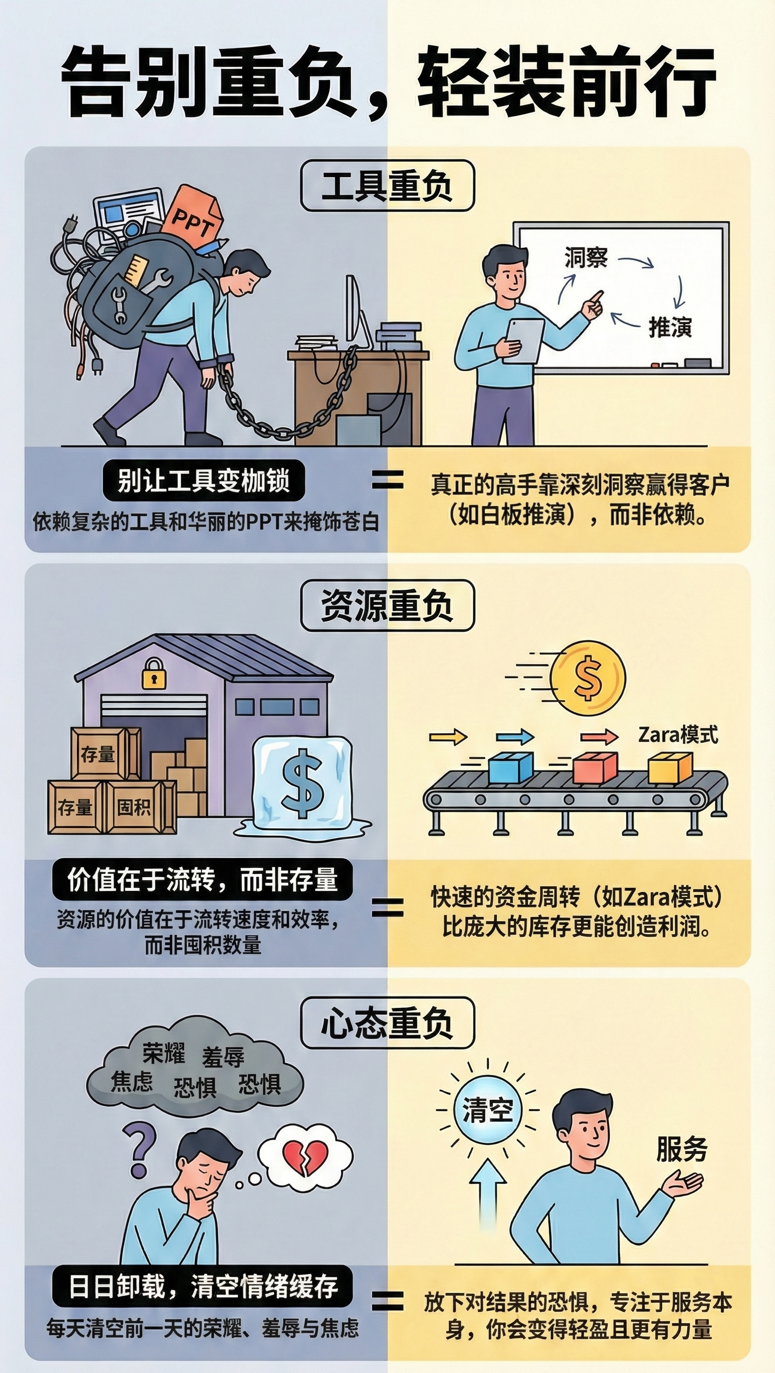 我们潜意识里有一个错误的公式:拥有的资源 + 先进的工具 + 巨大的压力 = 胜算。但现实往往给出一记响亮的耳光。那些背负着沉重行囊、武装到牙齿的“重装步兵”,在瞬息万变的商业战场上,往往跑不过那些身手矫健、反应灵敏的“轻骑兵”。在丛林战中,活下来的不是恐龙,而是豹子。