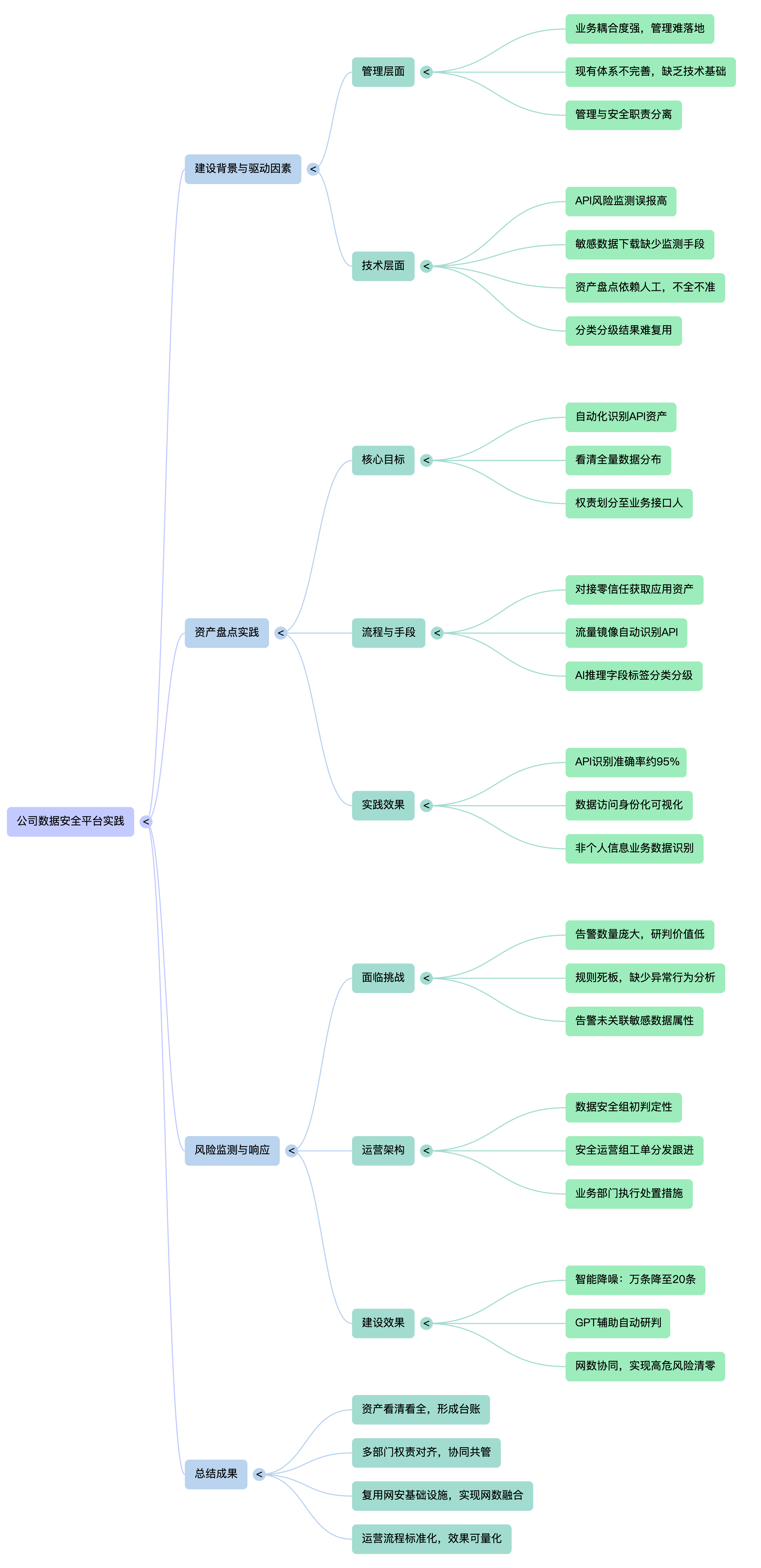 详细记录了案例公司在数字化转型过程中构建数据安全治理体系的具体历程。案例公司在初期面临着管理与技术脱节、资产盘点过度依赖人工以及风险监测响应薄弱等核心挑战。为解决这些痛点,公司通过部署数据安全大脑平台,借助AI大模型在数据安全上的能力,实现了自动化资产识别、API意图推理及精准的数据分类分级。该方案成功将数据安全深度融入现有的网络安全运营体系中,确立了多部门协同的权责边界。实践证明,这种“以监促管”的架构显著提升了敏感数据的覆盖率与合规监控效率,有效优化了整体安全投资。通过技术手段赋能,案例公司最终构建起了一个闭环、可视化且高效的数据安全运营环境。