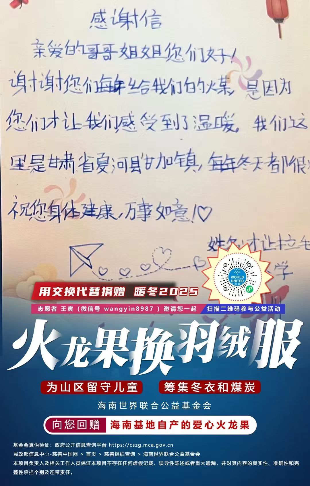 【特别倡议:暖冬 2025】 特别附上由海南世界联合公益基金会发起的“用交换代替捐赠”活动。您可以捐赠换取孩子们的羽绒服或取暖煤炭,并收到来自大山的馈赠(火龙果、土豆及感谢信)。