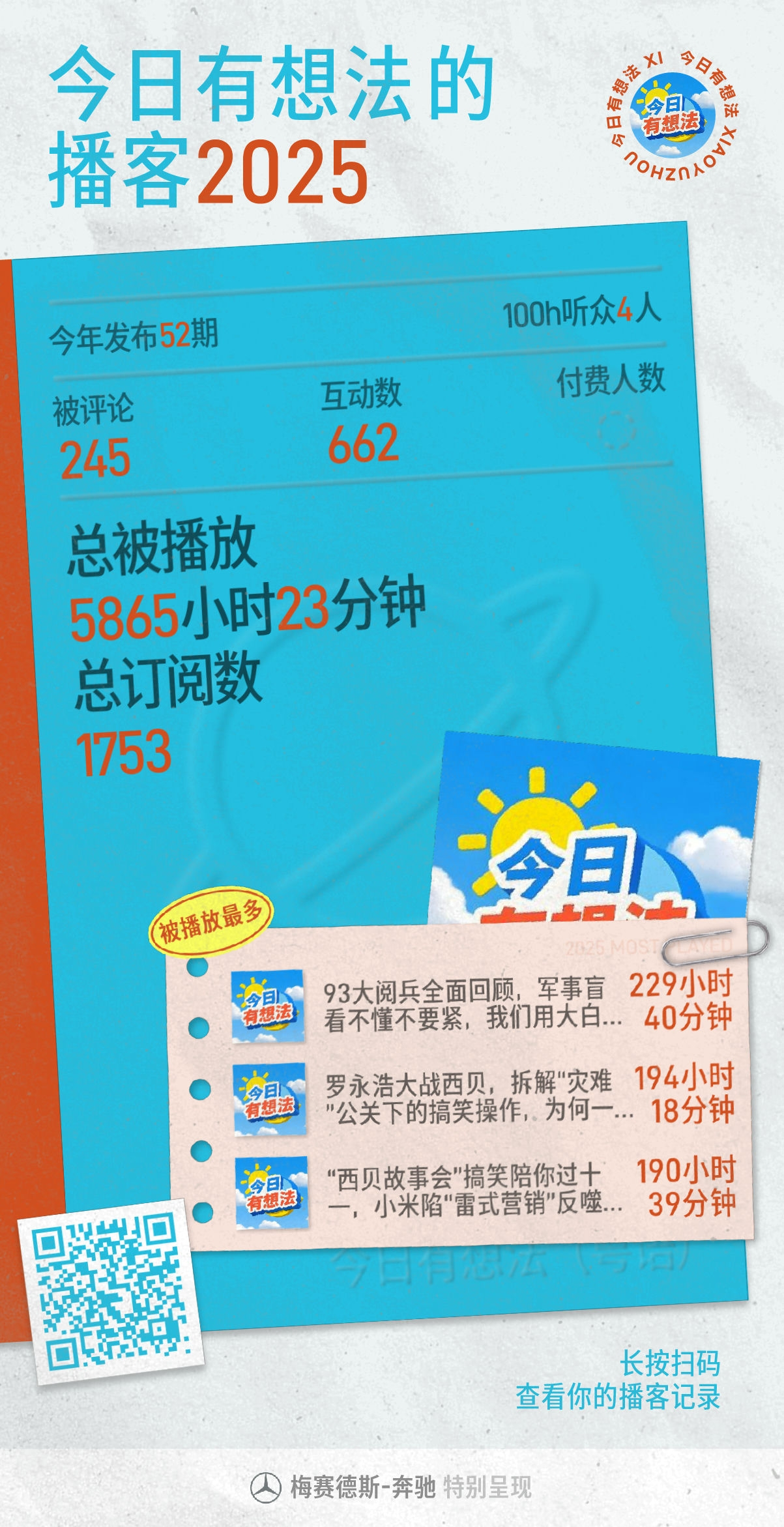 2025年眨眼又要结束,非常感谢每一位一直支持我们的朋友。今日有想法能陪伴各位在2025年的闲暇时光、通勤路上、还是上班摸鱼,能给你带来一点快乐或者干货,让大家在彼此的岁月共同成长,就是我们最大的荣幸。无论你是新朋友还是老听众,喜欢默默收听还是喜欢与我们留言互动,你的每一次的点击收听、互动留言、分享点赞,我们都记在心里!你们的喜欢就是我们坚持最大的动力。最后,再次感谢大家2025年的支持,让我们相约2026再见!