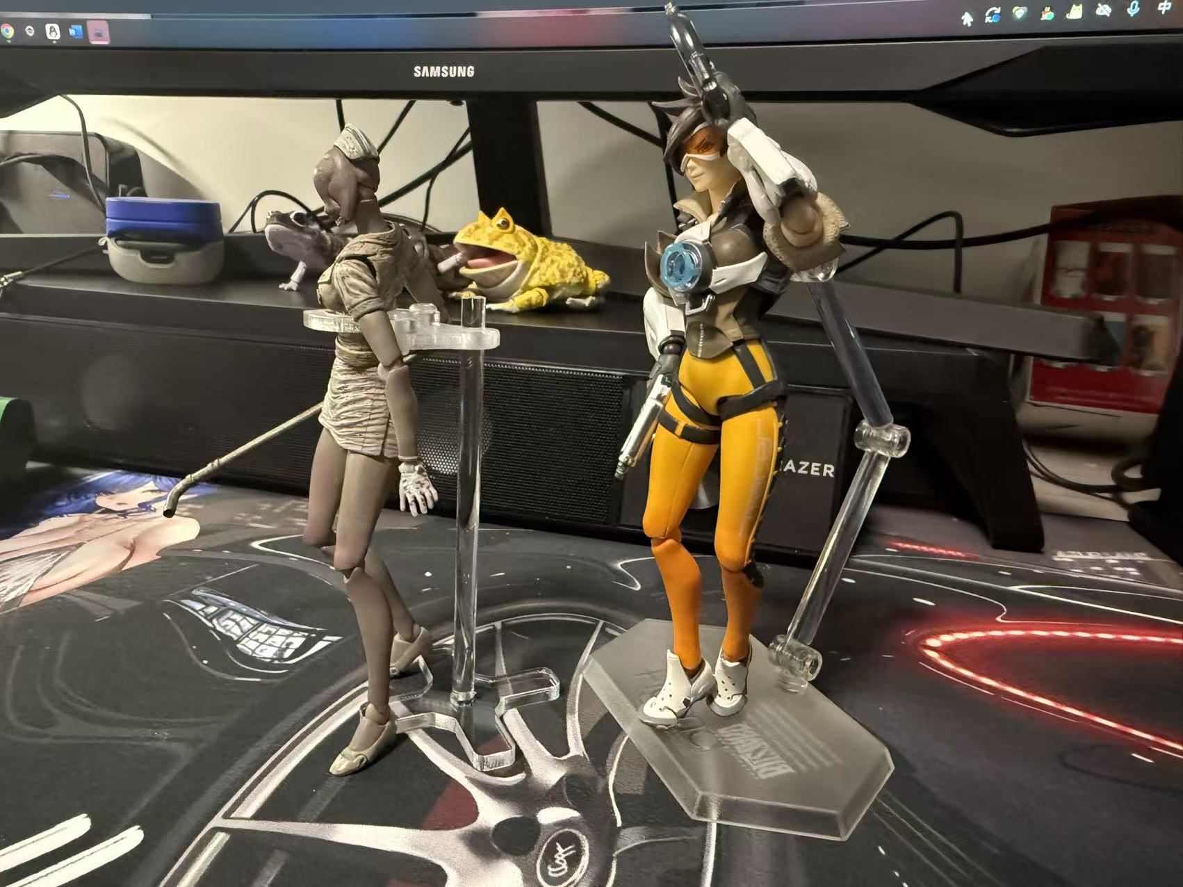 1:02:25 BioLab的亚克力支架(左),适配小比例人偶节省空间,方便摆放。