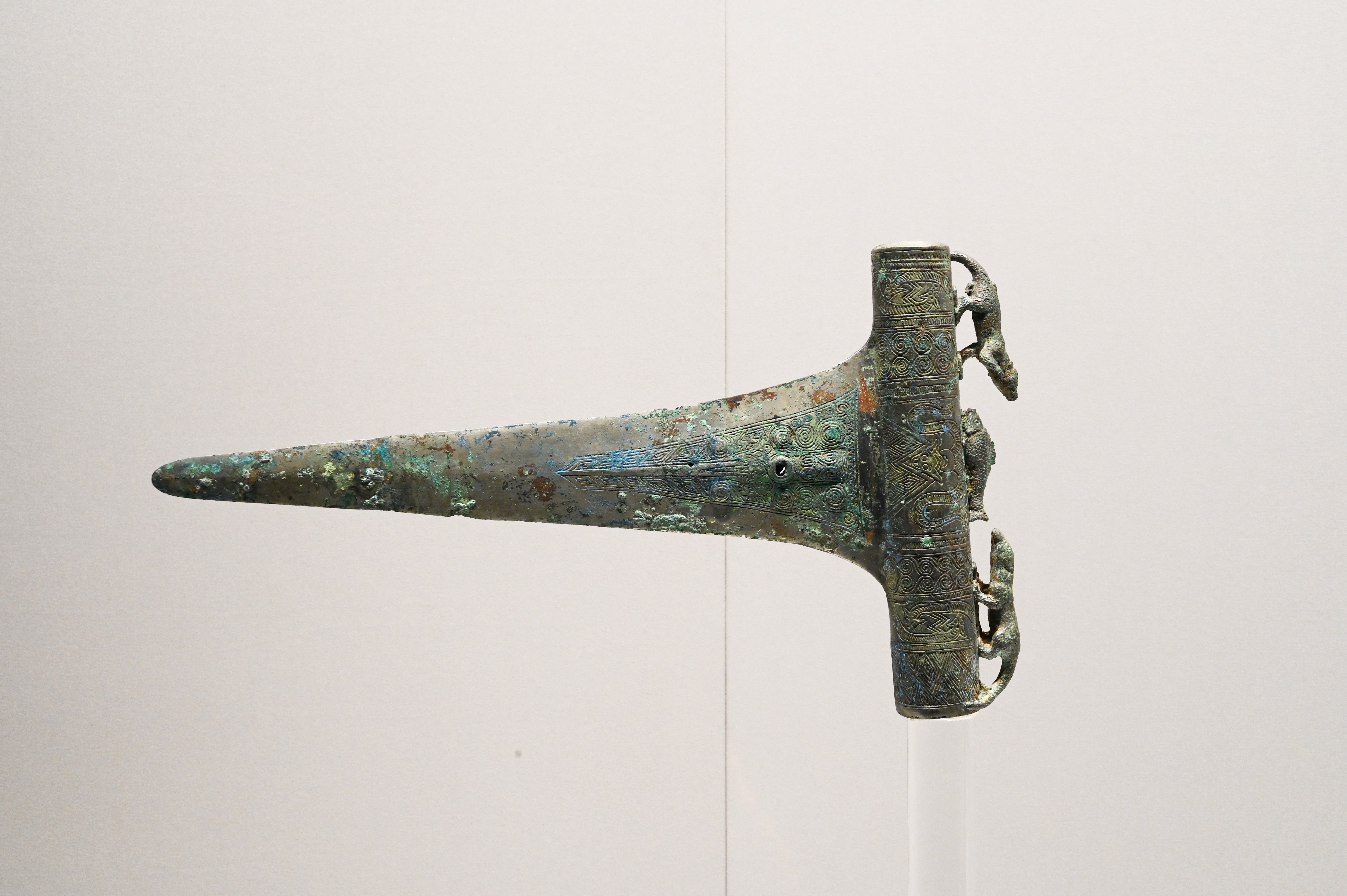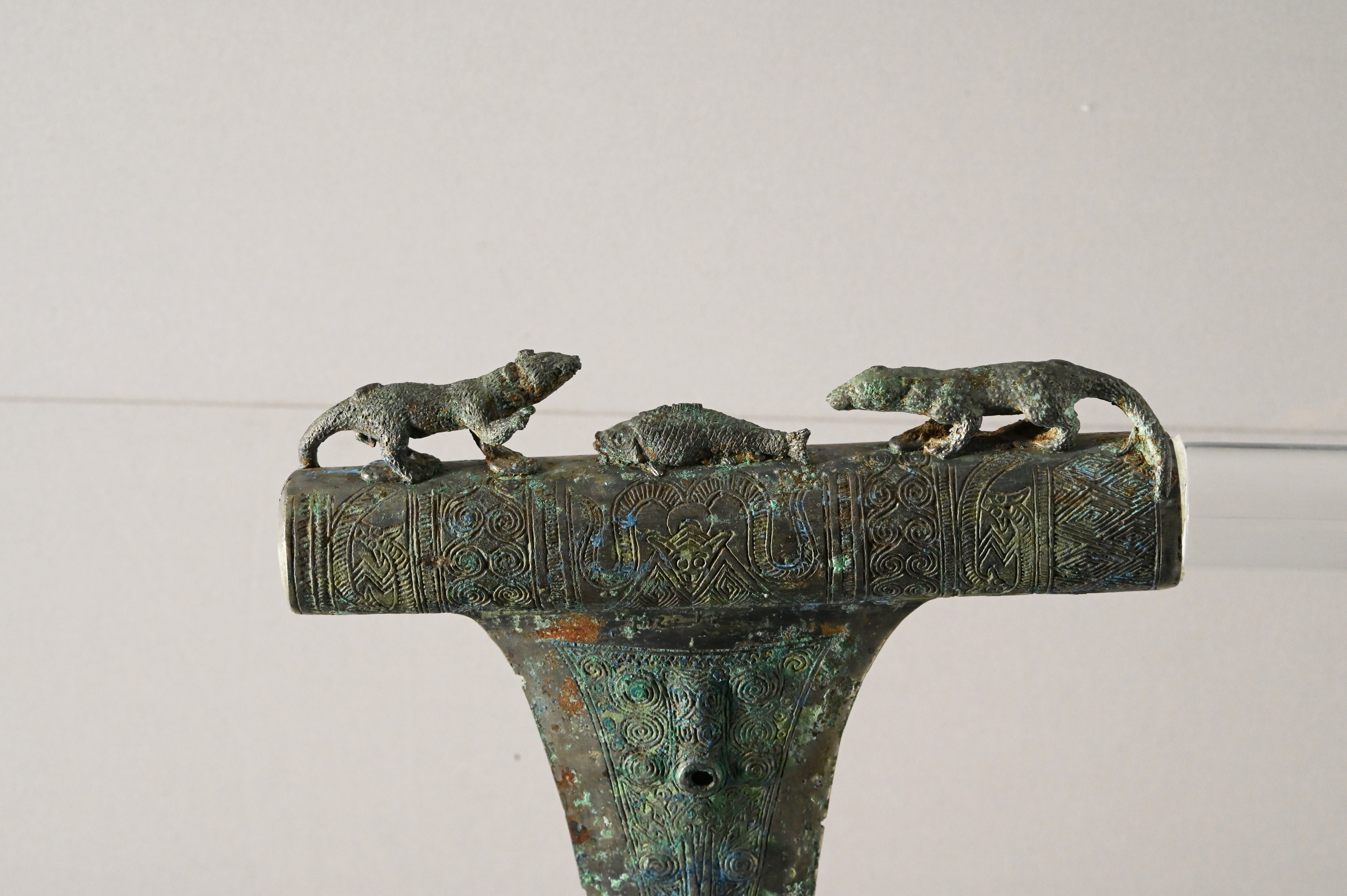 (云南地区滇国青铜器)西汉,双獭捕鱼戈,1956年云南晋宁石寨山出土,上海博物馆藏(图源:场长)