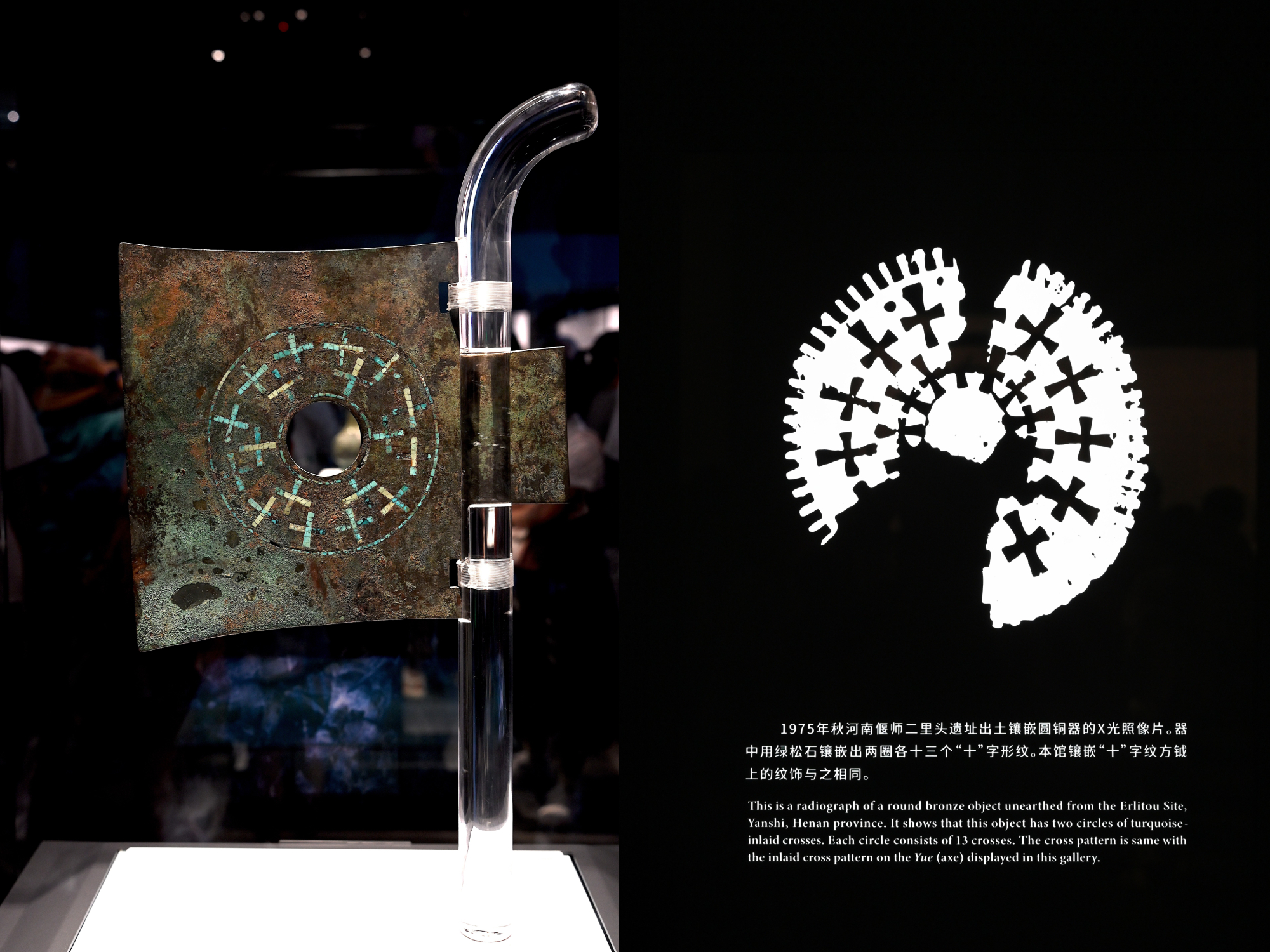 右图:1975年秋河南偃师二里头遗址出土镶嵌圆铜器的X光照像片,器中用绿松石镶嵌出2圈各13个“十”字形纹。与镶嵌十字纹方钺上的纹饰相同。(均为场长现场拍摄)