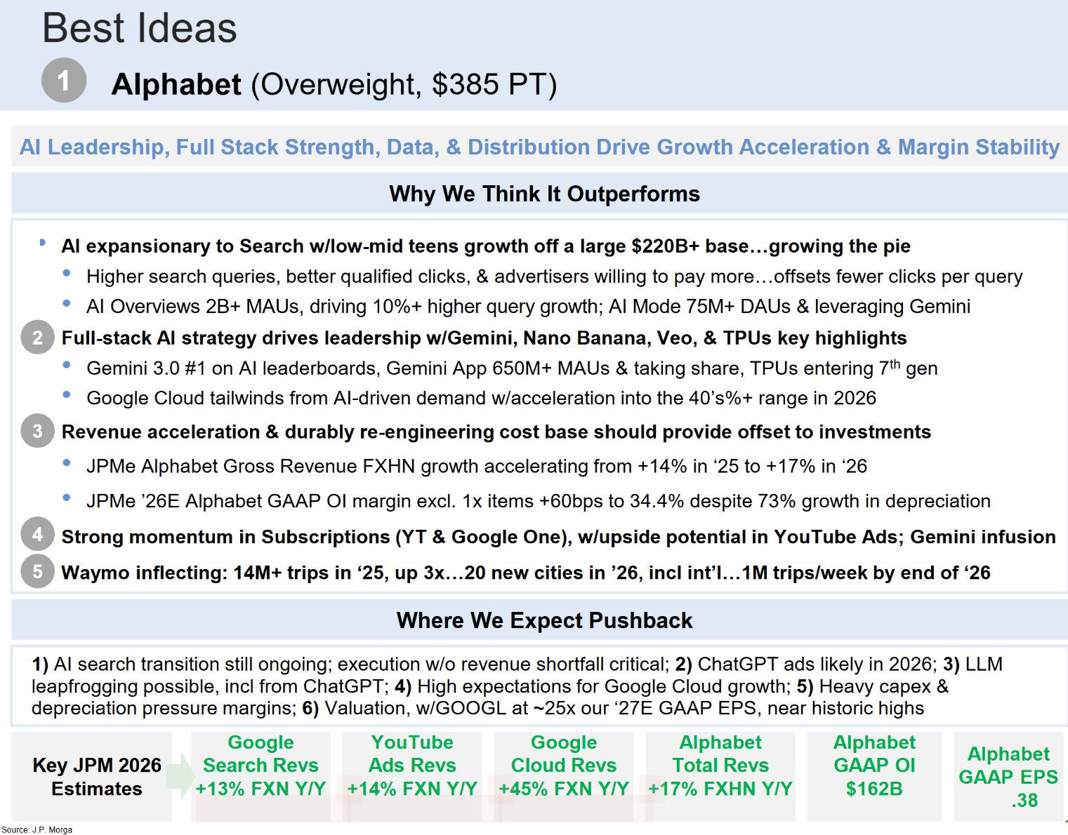 而龙头公司的AI布局已经进入收获期(见图4,研报第9页):Alphabet(谷歌)凭借Gemini 3.0占据AI leaderboard榜首,AI Overviews拥有20亿+月活,带动搜索查询量增长10%以上;谷歌云2026年增速将冲刺40%+,Waymo自动驾驶将扩展到20个城市,年底实现每周100万次出行。摩根大通给其目标价385美元,还有20%上涨空间。