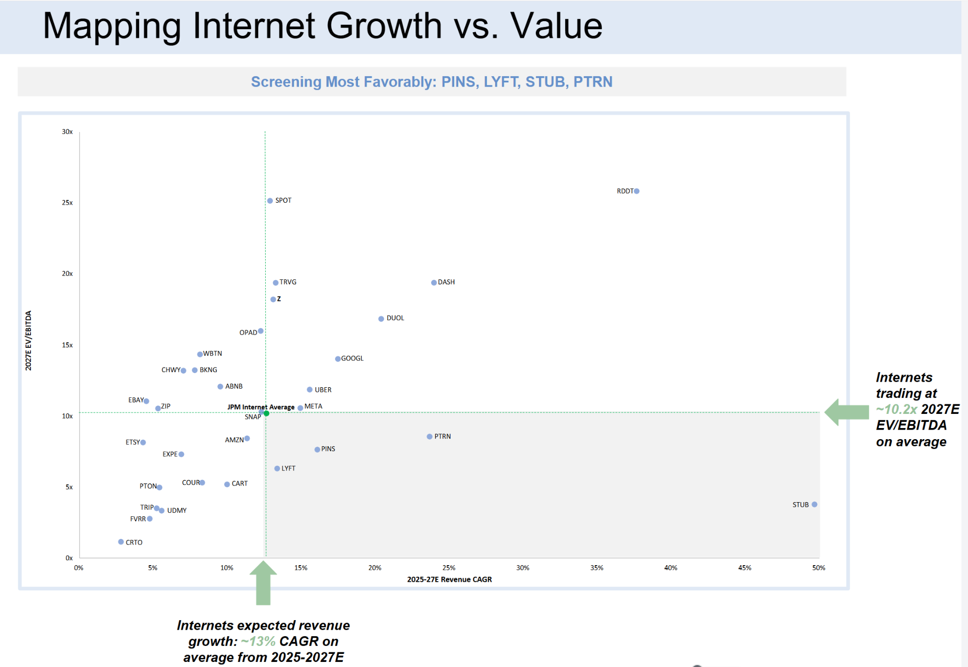AI到底如何重塑互联网?看这张增长与估值映射图就懂(见图3,研报第7页):互联网公司2025-2027年平均营收CAGR约13%,平均EV/EBITDA为10.2x,而PINS、LYFT、STUB等公司实现了“高增长+低估值”的黄金组合。比如Pinterest,既保持16%的营收增速,估值又处于行业低位,成为研报重点推荐的价值标的。