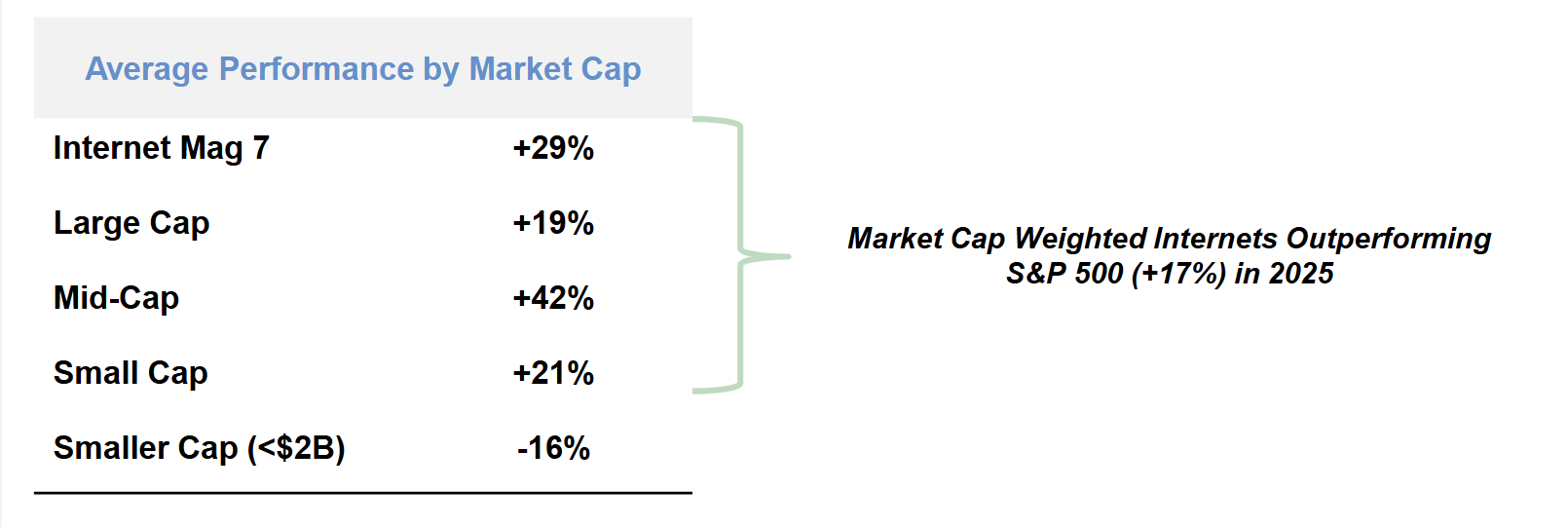 先看核心数据,2025年美股互联网板块已经提前预热(见图1,研报第3页):中盘股领涨大涨42%,大型股涨19%,而市值低于20亿美元的小市值股却跌16%,市值加权的互联网指数更是跑赢标普500指数(+17%),分化格局已经非常明显。这背后不是偶然,而是AI驱动的强者恒强逻辑开始显现。