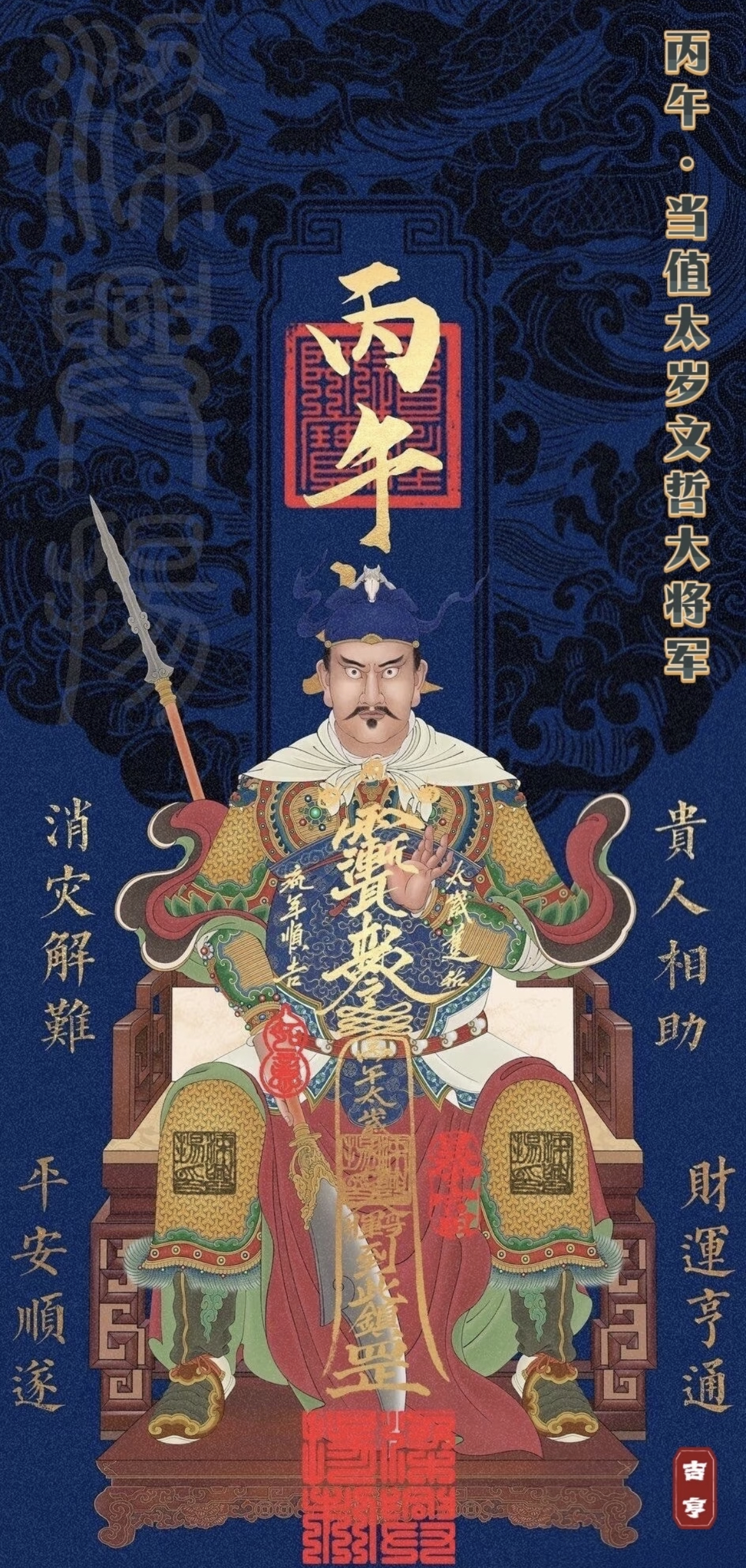 丙午太岁文哲大将军的原型是明朝有名的清官王缜,字文哲。他一生刚正不阿,出使外邦时拒绝跪拜,拒收厚礼,坚决维护国家尊严;任上整顿弊政,救灾恤民,为百姓办了无数实事,最后积劳成疾殉职在岗位上。因清廉勤政,心系苍生,深受百姓爱戴,也被为官为仕之人奉为榜样,身后在民间信仰和道教文化之中,被尊为六十甲子神之一,专门值守丙午年。