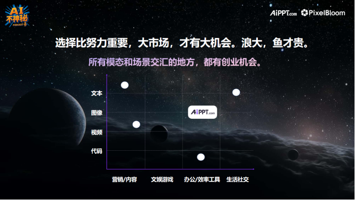 【垂类赛道】 垂直细分领域的市场赛道,如AiPPT.com专注于PPT制作这一细分方向,而非做全套办公软件。精准定位细分需求的创业策略。