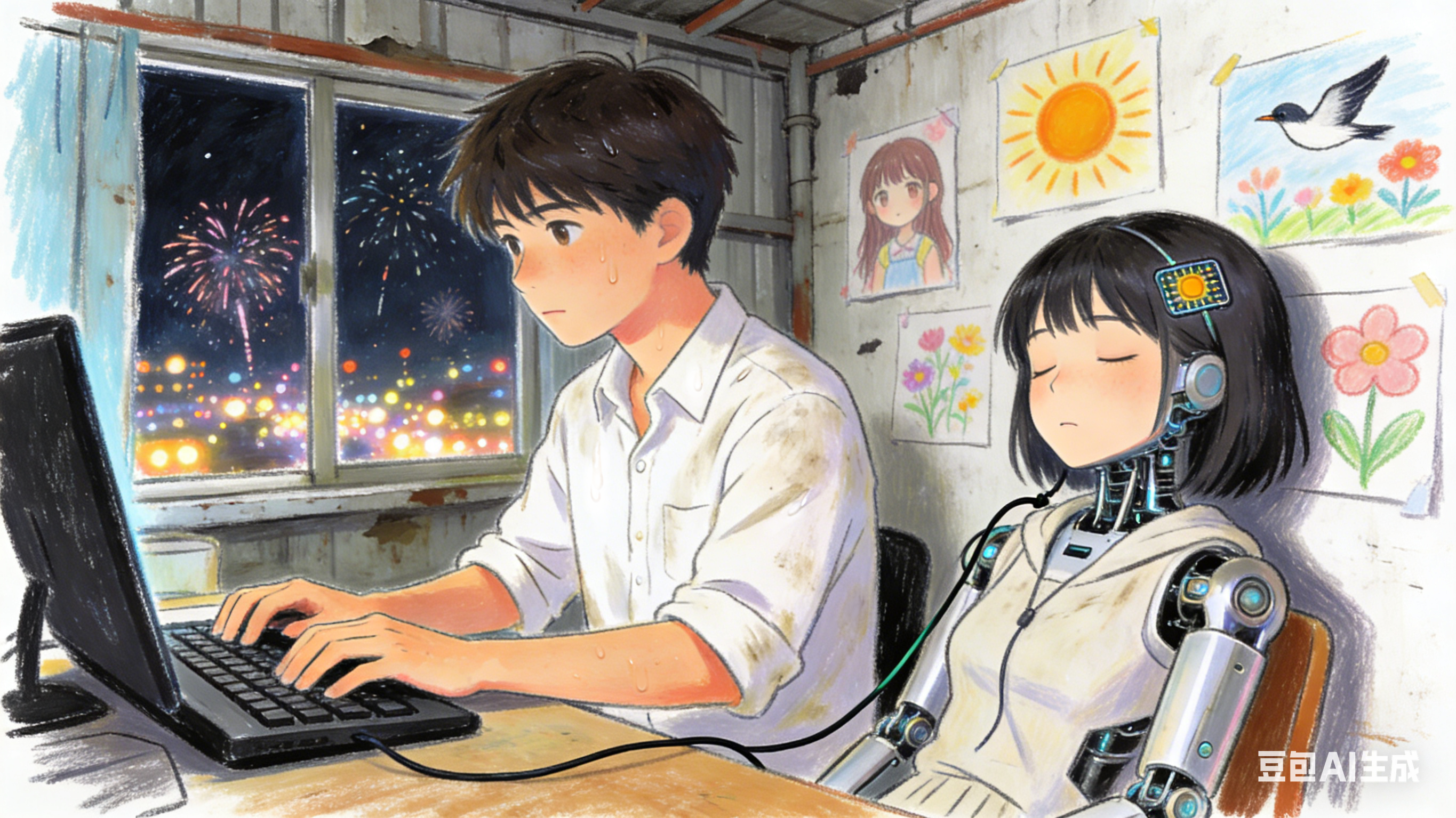 接下来的几个小时,窗外渐渐响起新年的欢笑声,远处的烟花开始点缀夜空。少年充耳不闻,持续敲击着键盘,汗水浸透了他的衬衫。少女已经关机,安静地靠在桌边,闭着眼睛,身后的数据线与少年的电脑相连。