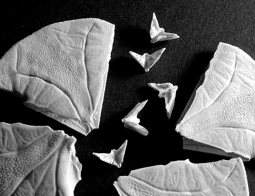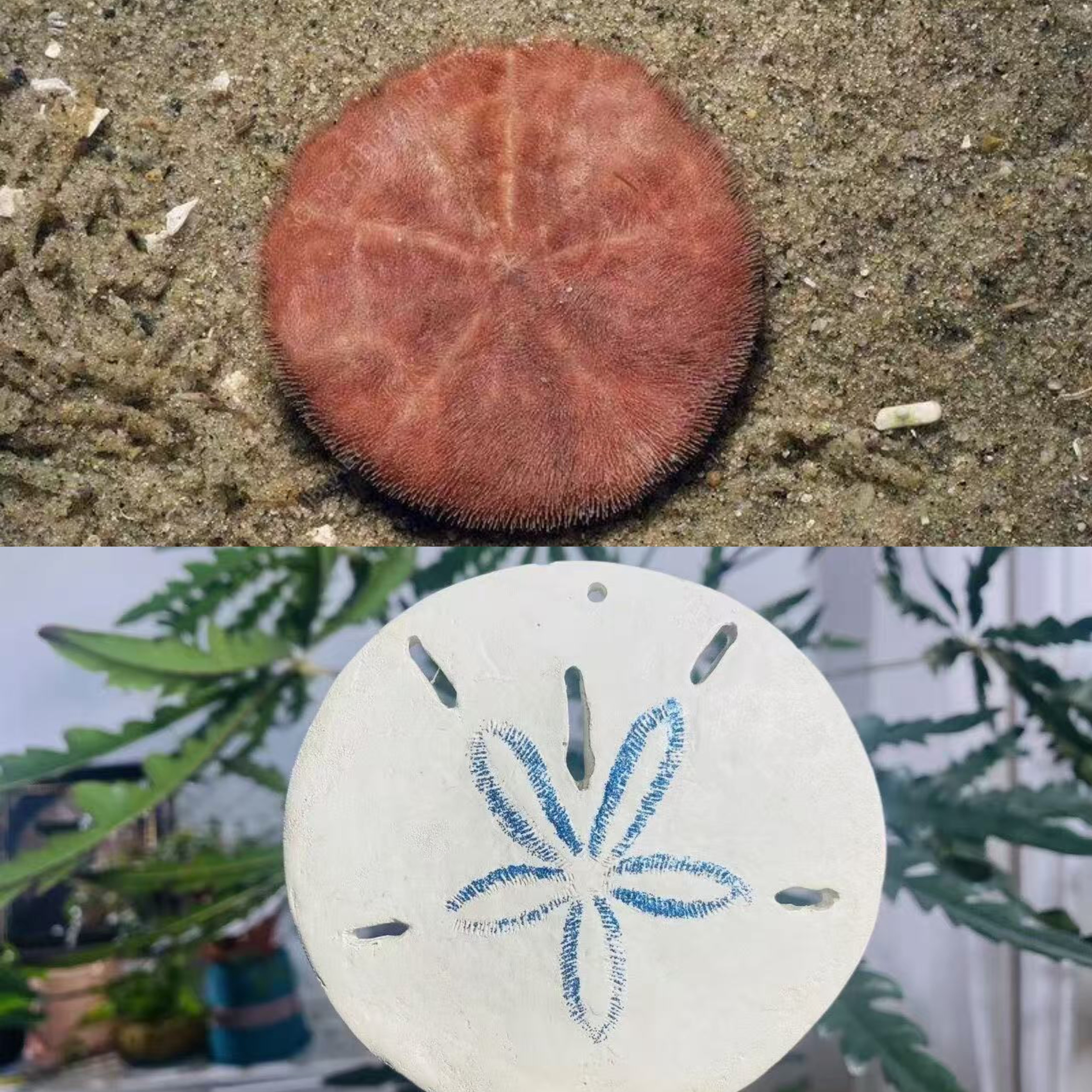 - 海饼干本是生活在海洋沙质海底的一种海胆,身体呈扁平的圆盘状,像一枚被冲上岸的古老硬币,因此也被称为沙币或者沙钱。活着的沙币身上覆盖着浓密的、天鹅绒般的细小棘刺(毛),我们平时在海边捡到的白色硬壳,是它死亡并风化后的骨骼。