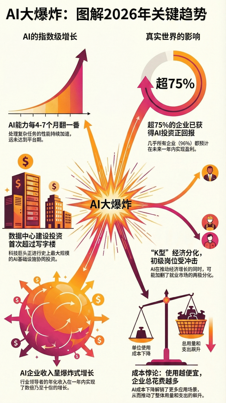 这份视频文案通过51张图表全面分析了人工智能在2026年到来之际的发展态势。内容涵盖了模型能力的飞速提升、基础设施的巨额投入,以及市场竞争中谷歌与Anthropic的强势崛起。作者强调了AI效率的进步正带动企业端实现投资回报,同时提及了“氛围编程”对软件开发模式的重塑。此外,文案还探讨了技术革新引发的就业结构性挑战以及日益显现的社会政治监管问题。总之,这些数据共同勾勒出AI正从单纯的技术热点转向深度影响全球经济与社会的深远变革。