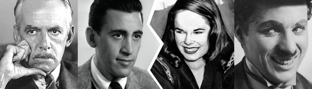 ▲ 塞林格的初恋纠葛:(从左至右)剧作大师尤金·奥尼尔,J.D.塞林格,塞林格女友乌娜·奥尼尔(尤金·奥尼尔之女);美国大师查理·卓别林(乌娜·奥尼尔丈夫,相差36岁)