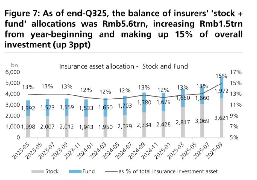 政策端的改革力度更是超出预期。国家金融监管总局下调保险公司权益投资风险因子,中国证监会则优化优质机构风控指标,适当放宽资本和杠杆限制,推动行业从价格竞争转向价值竞争。这意味着头部券商将获得更多资金运作空间,行业分化会进一步加剧。研报中Figure 7(保险公司股票+基金配置图表)显示,截至2025年三季度末,保险公司“股票+基金”配置余额达5.6万亿元,较年初增加1.5万亿元,占整体投资比例升至15%,长期资金入市的政策效果已逐步显现。