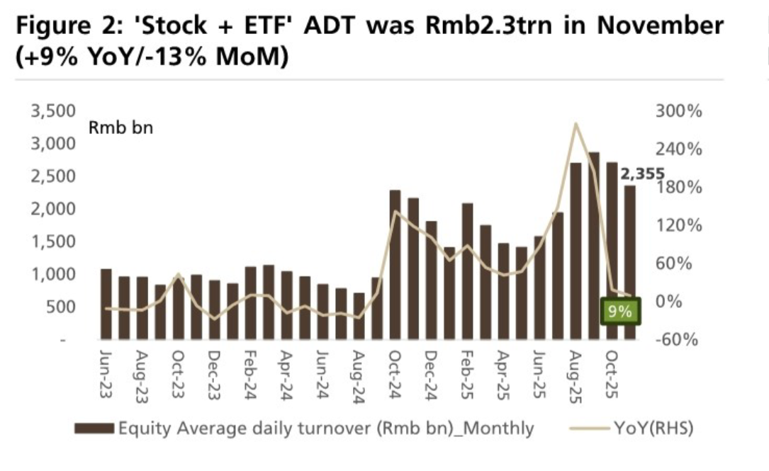 先看一组核心数据,直观感受市场热度。研报中Figure 2(股票+ETF日均成交额图表)显示,11月“股票+ETF”日均成交额达2.3万亿元,同比增长9%,虽然环比下降13%,但相比去年同期仍显强劲,这一数据印证了市场交易活跃度的韧性。而Figure 3(两融余额图表)更能说明资金面的积极信号,截至11月底两融余额2.5万亿元,同比大幅增长35%,仅环比微降0.1%,长期资金入市趋势明显。