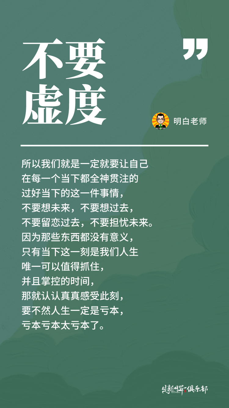 有的人嗯二十四小时是麻木的,那你觉得哪一个更划算?很明显是后者。所以我们就是要一定就要让自己在每一个当下都全神贯注的过好当下的这一件事情,不要想未来,不要想过去,不要留恋过去,不要担忧未来。因为那些东西都没有意义,只有当下当下这一刻是我们人生唯一可以值得抓住,并且掌控的时间,那就认认真真感受此刻,要不然人生一定是亏本,亏本亏本太亏本了。