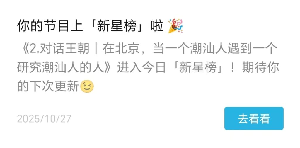 OK,跑题了,拉回来。在这期节目里,我主要讲的是这么一个问题——我为什么要做一档以潮汕为主题的播客?显然,这么小众的选题,从流量的角度来讲,并不是一个好的选择。