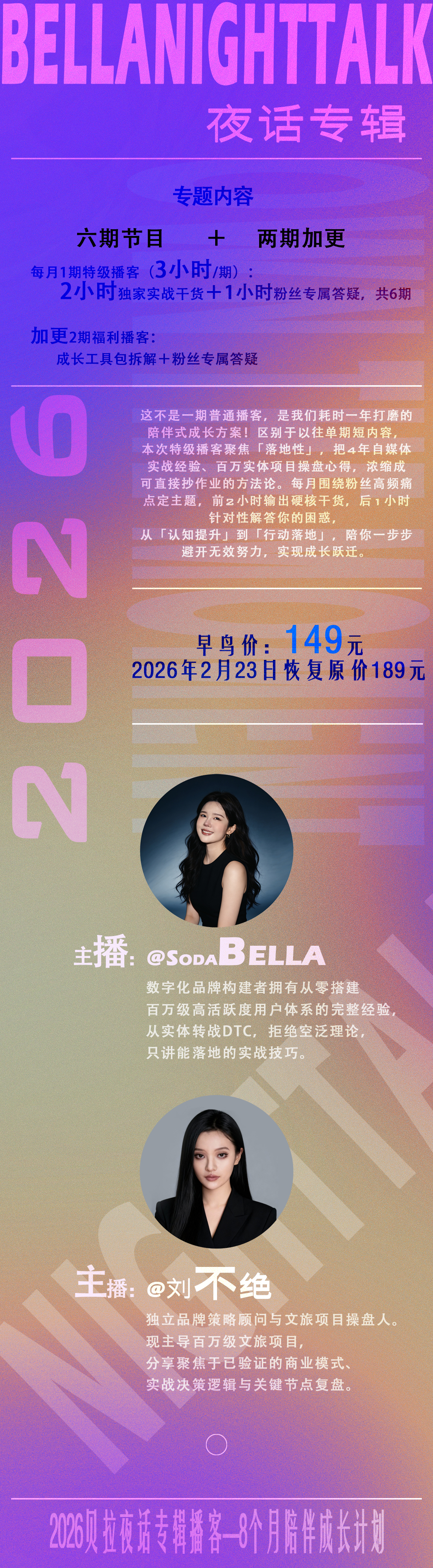 Hello,各位听众朋友,欢迎解锁贝拉夜话的专属深度场域,本次特级播客聚焦「落地性」,把4年自媒体实战经验、百万实体项目操盘心得,浓缩成可直接抄作业的方法论。每月围绕粉丝高频痛点定主题,前2小时输出硬核干货,后1小时针对性解答你的困惑!接下来的半年,我们会以最较真的态度,陪你拆解人生的底层逻辑,更要给你能落地的个人应对方案——不做空泛的舆论解读,只解决“事件和我有关吗?我该怎么应对?”的核心困惑。