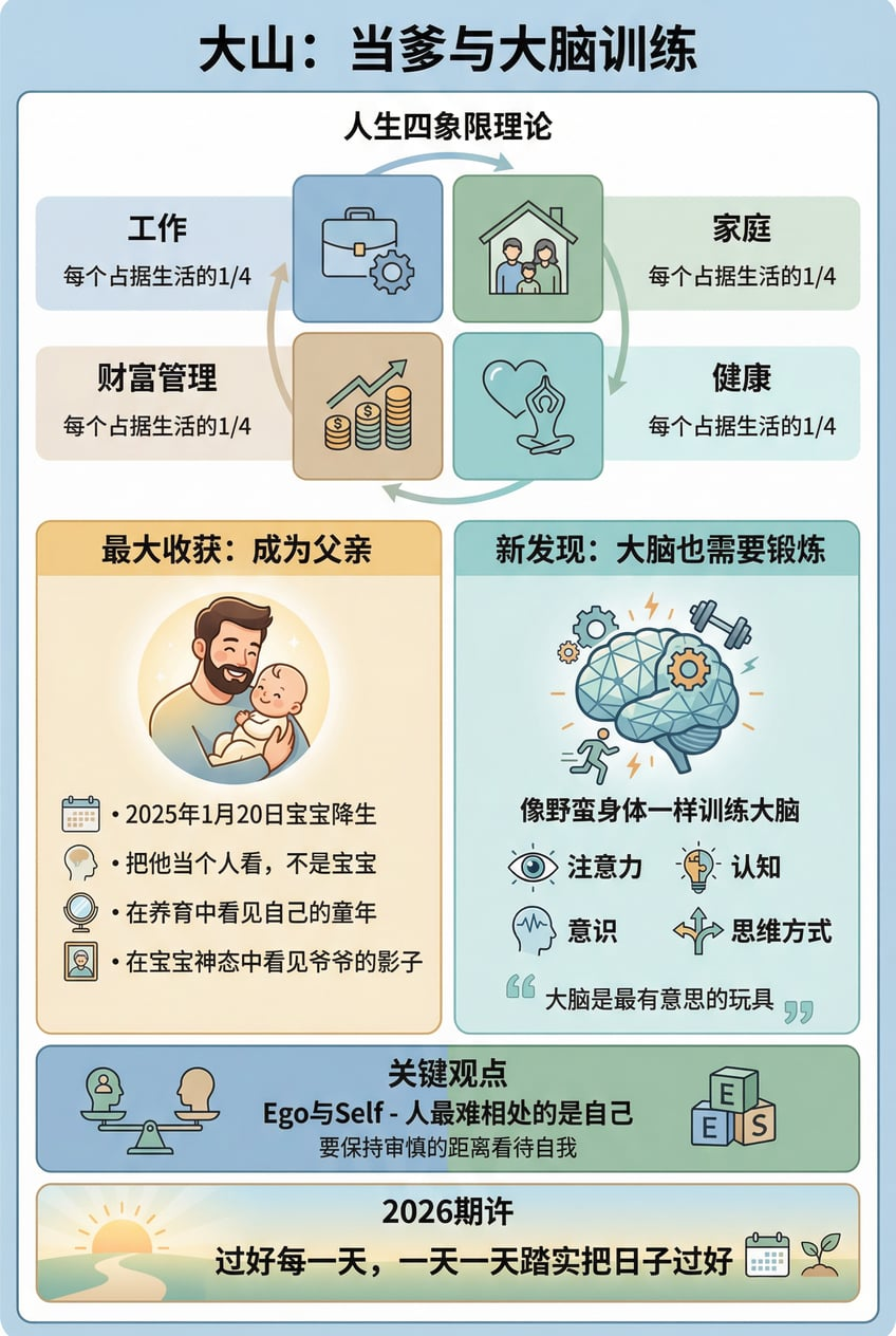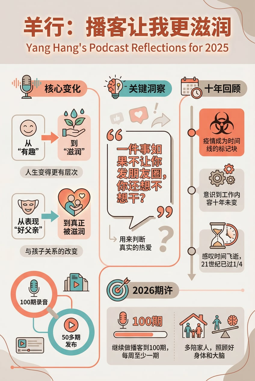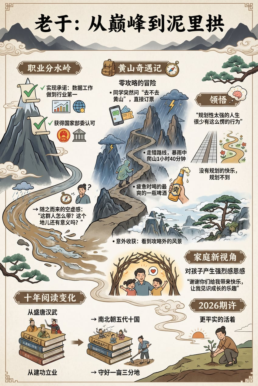 年底这桌茶局,我们四个老朋友把 2025 复盘了一遍:事业里程碑后的空虚、当爹后的底层重排、生活 KPI 化带来的紧绷,以及一个很切肤的发现——人生总有点“来不及”。当然,其中还有一段令人啼笑皆非的“零攻略黄山”离谱经历,暴雨缺水后一瓶啤酒直接封神。聊到最后,我们得到了这 10 年与 21 世纪的四分之一带给我们的启示:更平实地生活,把每一天过好。2026 开年第一期,送给同样在复盘的你。