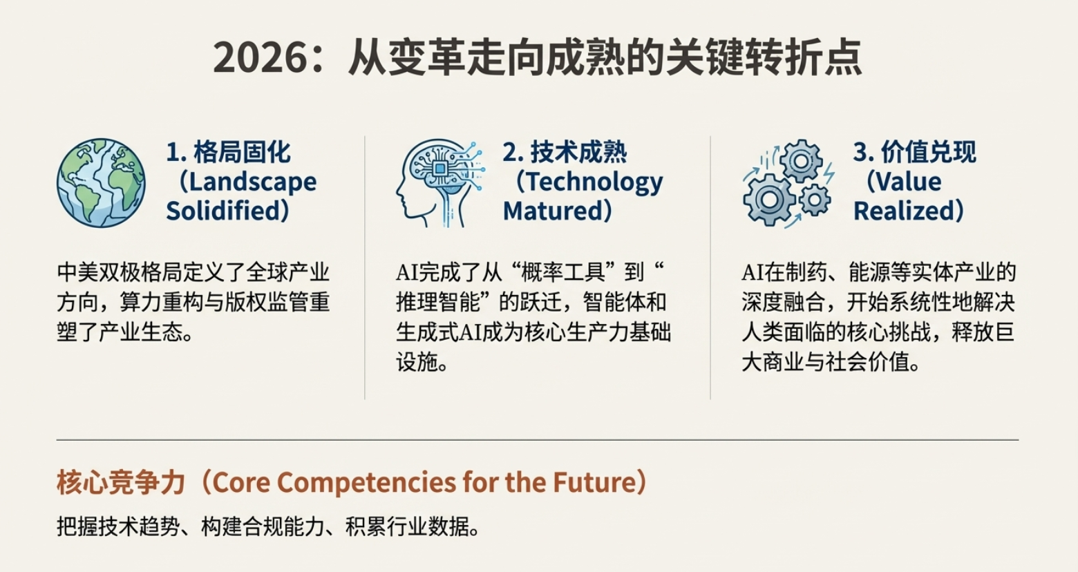 2025年的硝烟尚未散去,全球AI领域已站在一个决定性的分水岭之上。若将过去几年比作大模型的“军备竞赛”,那么2026年,全球将进入 “实战部署与生态锁定期” 。技术突破不再以单纯的参数量级或演示惊艳度来衡量,其价值将直接体现为对生产效率、商业模式乃至国家竞争力的重塑强度。作为资深战略与投资观察者,我们基于对产业信号、资本流向与技术演进路径的深度研判,提出以下面向2026年的十大核心猜想。这不仅是趋势预测,更是一份理解未来三年AI世界权力结构变迁的战略地图。