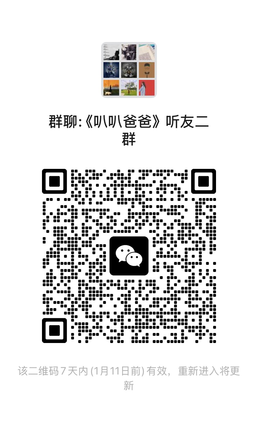 扫描下图二维码,加入《叭叭爸爸》微信群,一起缓解育儿焦虑吧!