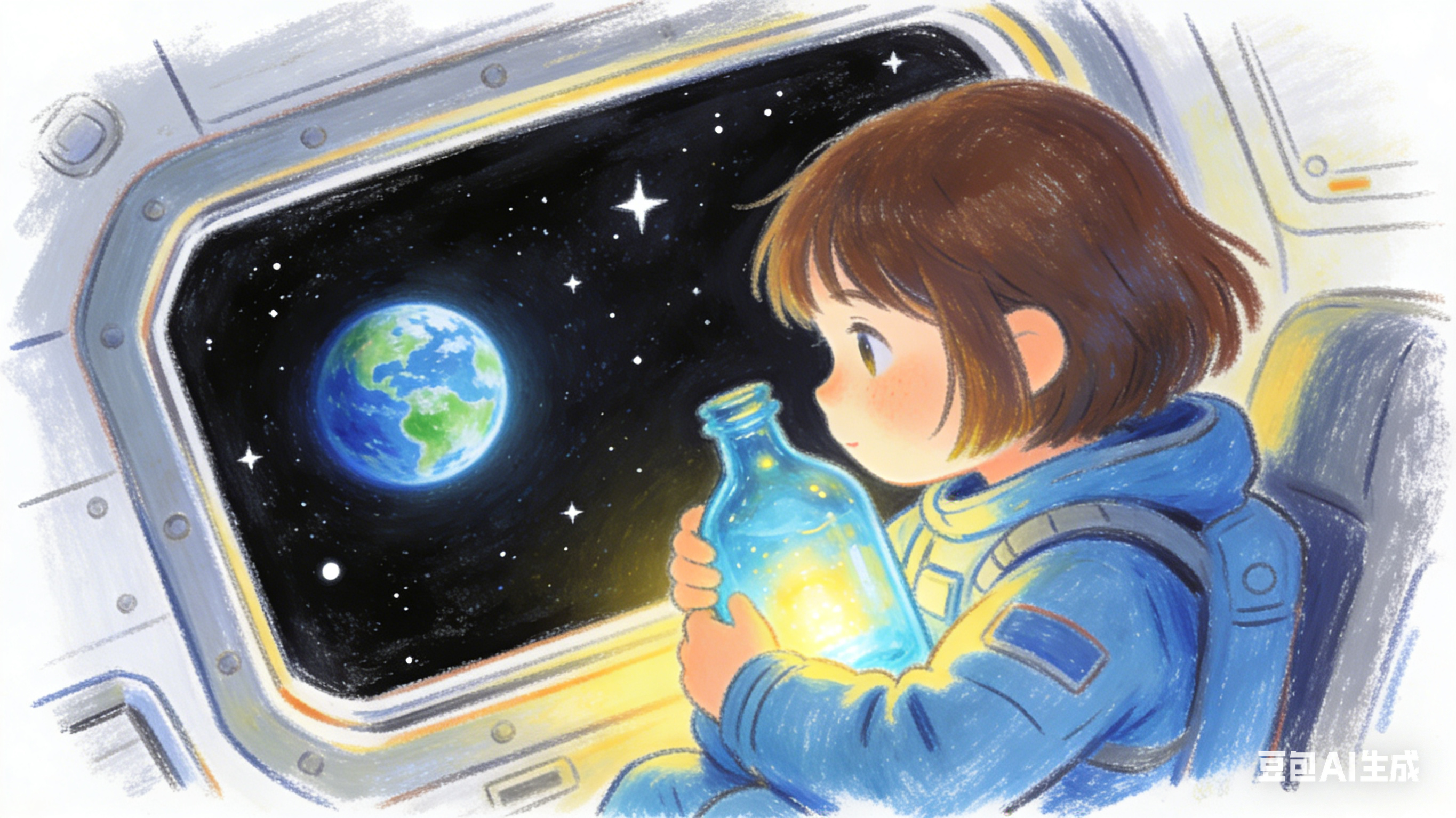 故事继续:移民飞船起飞那天,女孩把瓶子紧紧抱在怀里。透过舷窗,她看到地球渐渐变小,最后消失在星海中。她打开一个瓶子,倒出一片海蓝色玻璃。在飞船的人造光下,那片玻璃竟微微发光,仿佛里面藏着一小片故乡的海。
