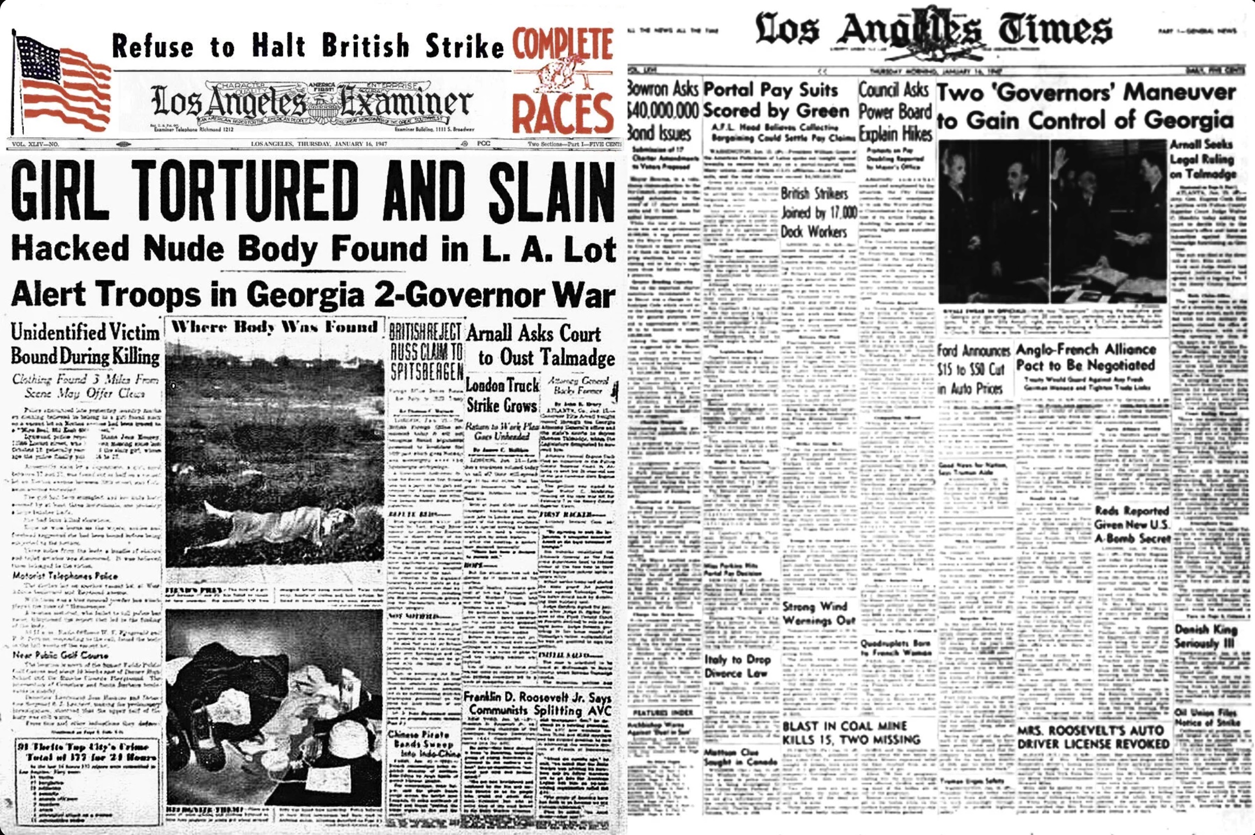 1947年1月15日,洛杉矶莱默特公园空地,一具年轻女子尸体被发现:22岁的伊丽莎白·肖特(Elizabeth Short,1924.7.29生)腰斩两截、血尽排水、脸刻“格拉斯哥微笑”、大腿切块(疑玫瑰纹身处)。媒体封“黑色大丽花”(Black Dahlia,灵感自1946 noir片《蓝色大丽花》),她生前追梦好莱坞、爱黑衣漂泊,恋空军少校Matt Gordon(空难亡),寄居Dorothy French家,最后现比特摩尔酒店(Biltmore Hotel,由“红发”Robert Manley送达)。