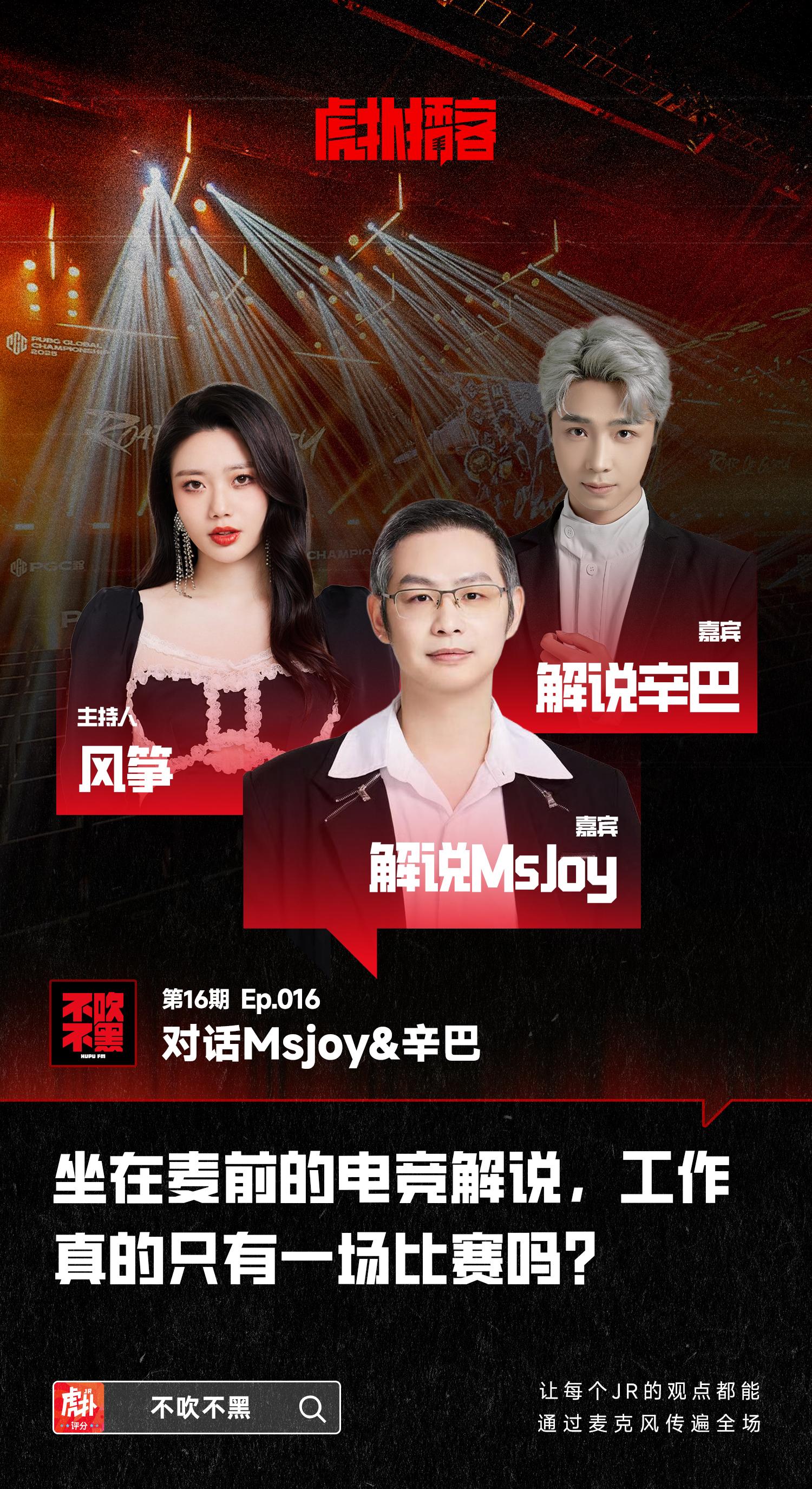 感谢各位JR对前几期节目的大力支持!本期节目为虎扑自制播客《不吹不黑》的第十六期内容,我们邀请到了电竞解说风筝担任主持人,以及电竞行业两位资深解说MsJoy和辛巴担任嘉宾,听他们深度揭秘电竞解说行业的台前幕后。