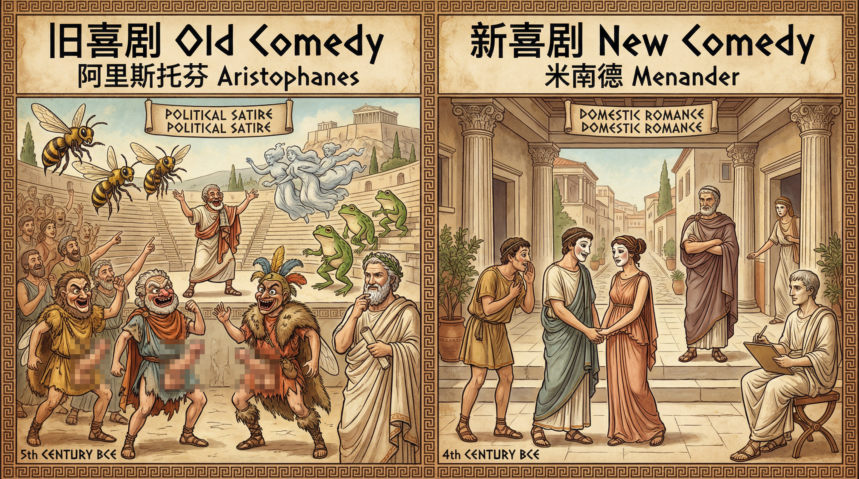 古希腊新旧喜剧的对比(图片来源:Generated by Manus)