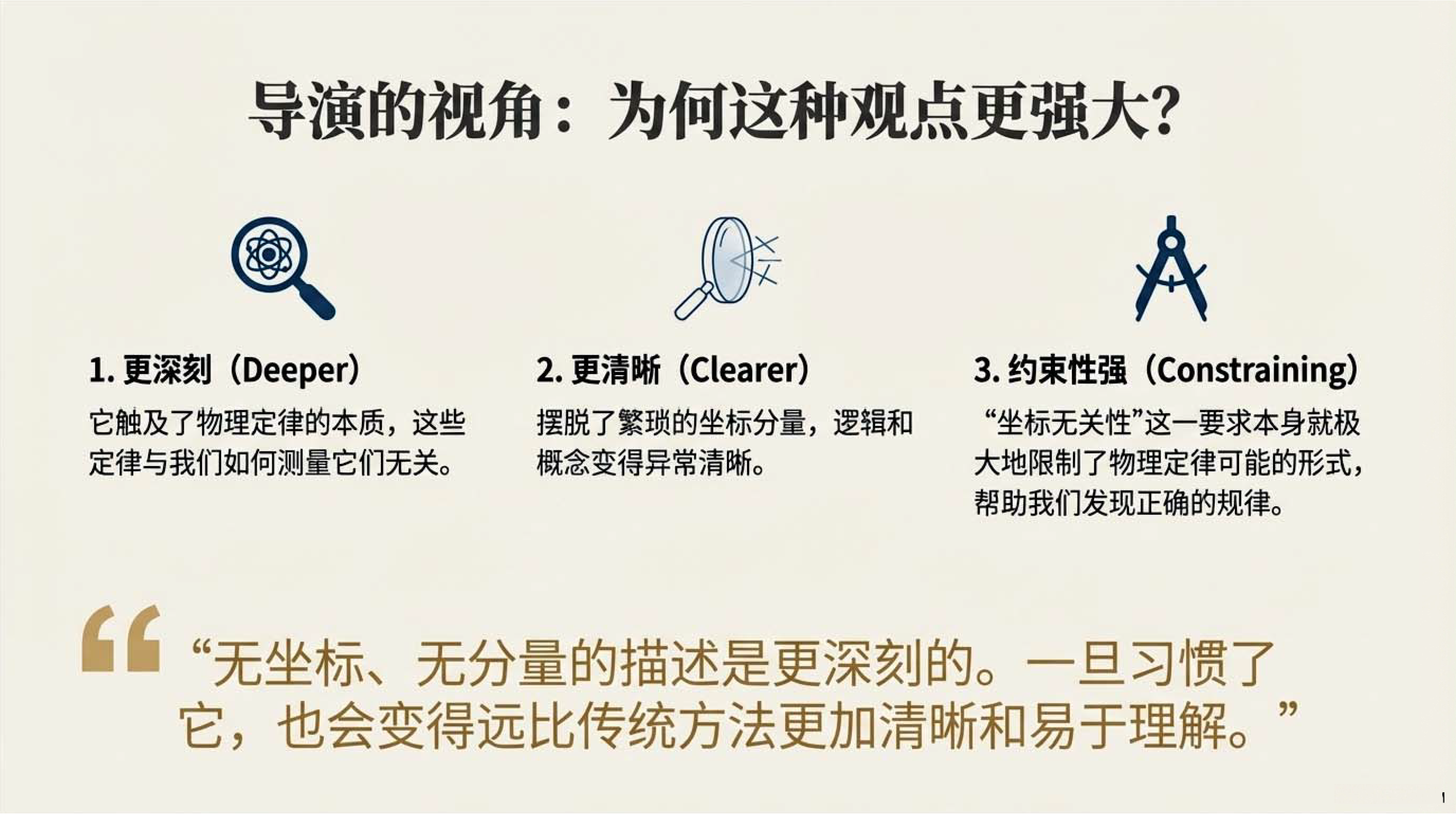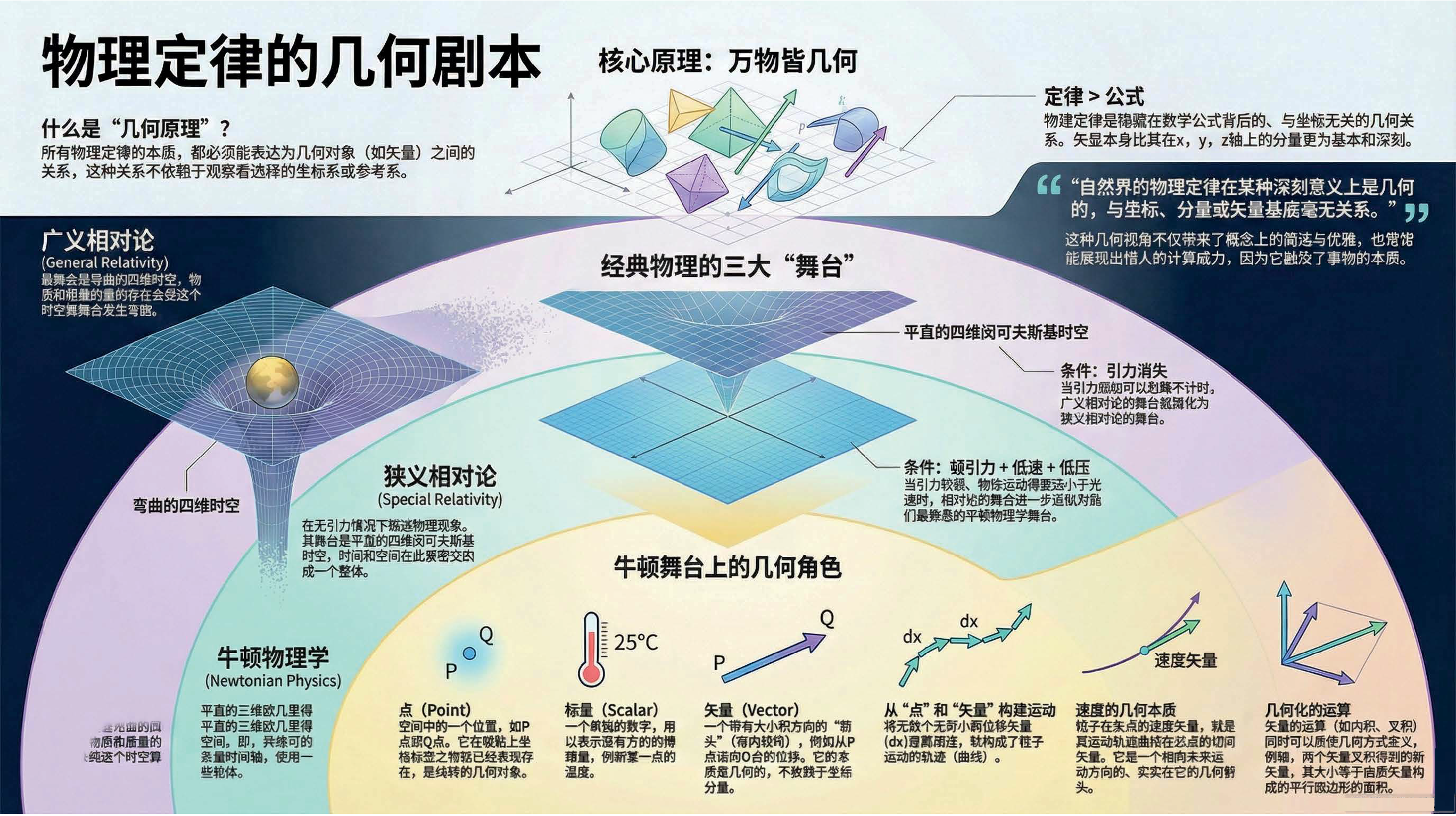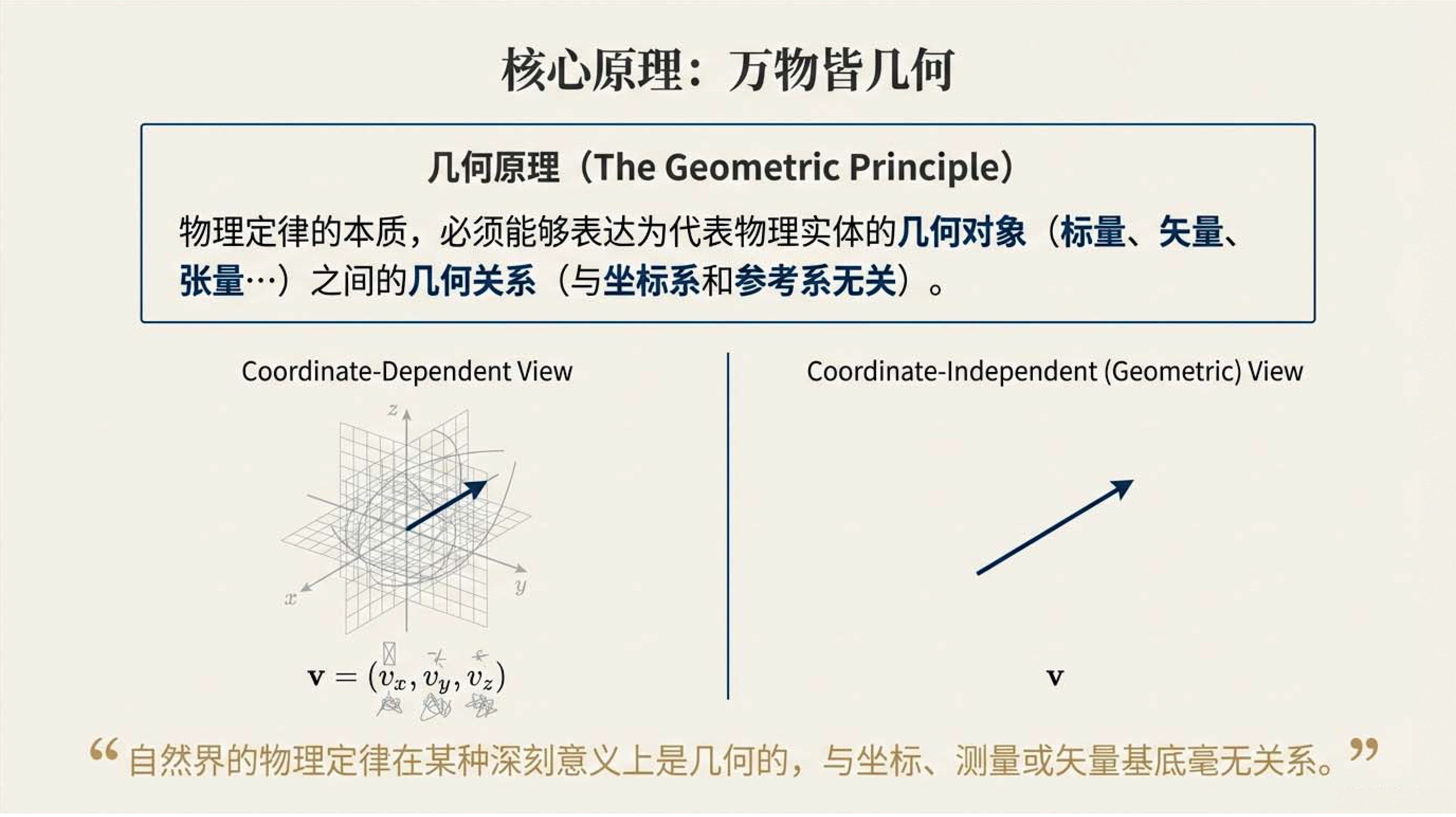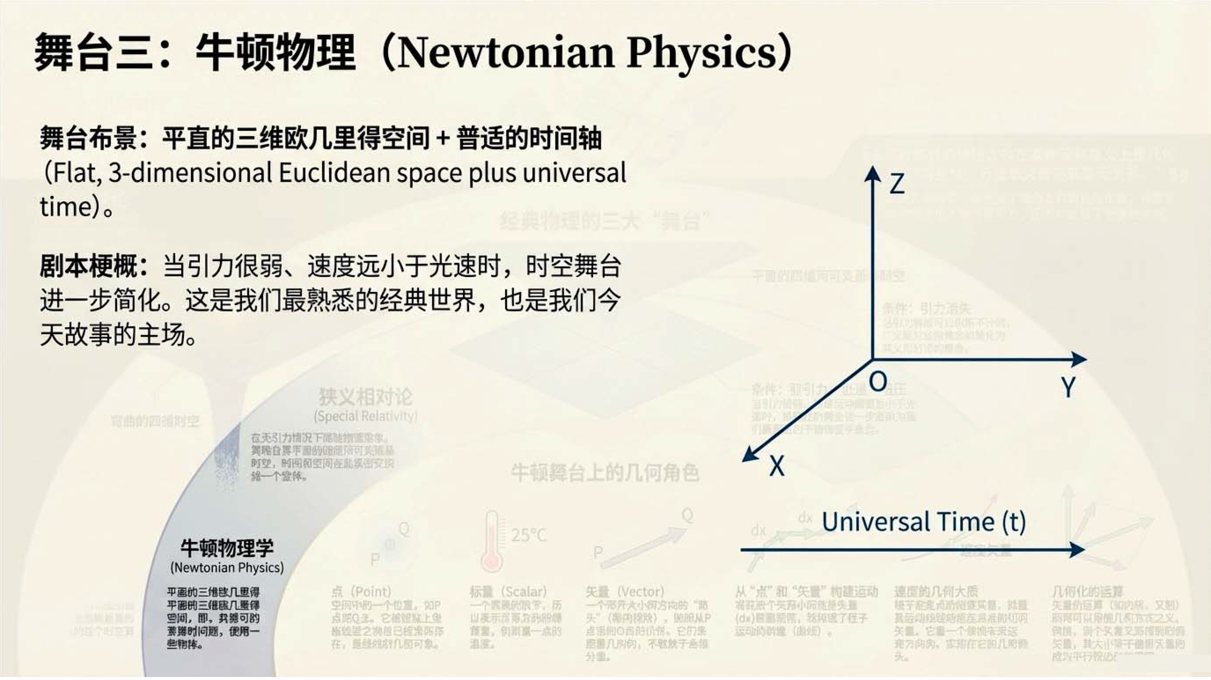 第1课视频的主要内容: 探讨物理定律背后共享的几何原理,介绍广义相对论、狭义相对论和牛顿物理学不同的舞台,阐述用几何原理解剖牛顿物理,认识基本几何对象和运算规则。该几何视角为理解更高阶物理开启新的大门。
